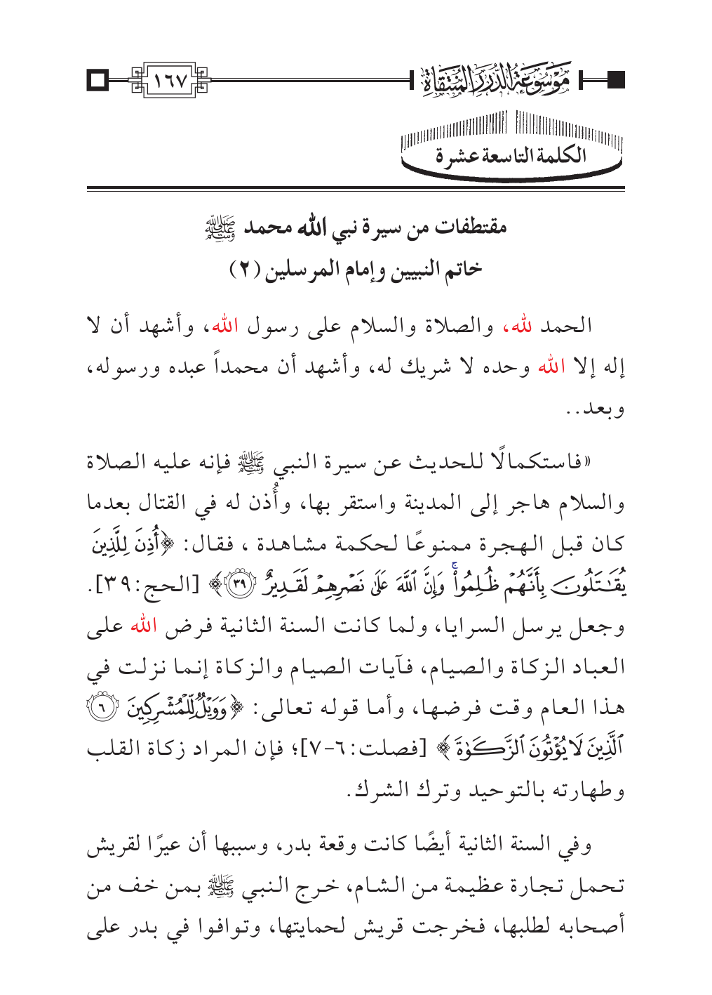 «فاستكمالًا للحديث عن سيرة النبي - صلى الله عليه وسلم - فإنه عليه الصلاة والسلام هاجر إلى المدينة واستقر بها، وأُذن له في القتال بعدما كان قبل الهجرة ممنوعًا لحكمة مشاهدة، فقال: {أُذِنَ لِلَّذِينَ يُقَاتَلُونَ بِأَنَّهُمْ ظُلِمُوا وَإِنَّ اللَّهَ عَلَى نَصْرِهِمْ لَقَدِيرٌ (٣٩)} [الحج:٣٩]. وجعل يرسل السرايا، ولما كانت السنة الثانية فرض الله على العباد الزكاة والصيام، فآيات الصيام والزكاة إنما نزلت في هذا العام وقت فرضها، وأما قوله تعالى: {وَوَيْلٌ لِلْمُشْرِكِينَ (٦) الَّذِينَ لَا يُؤْتُونَ الزَّكَاةَ} [فصلت:٦ - ٧]؛ فإن المراد زكاة القلب وطهارته بالتوحيد وترك الشرك.