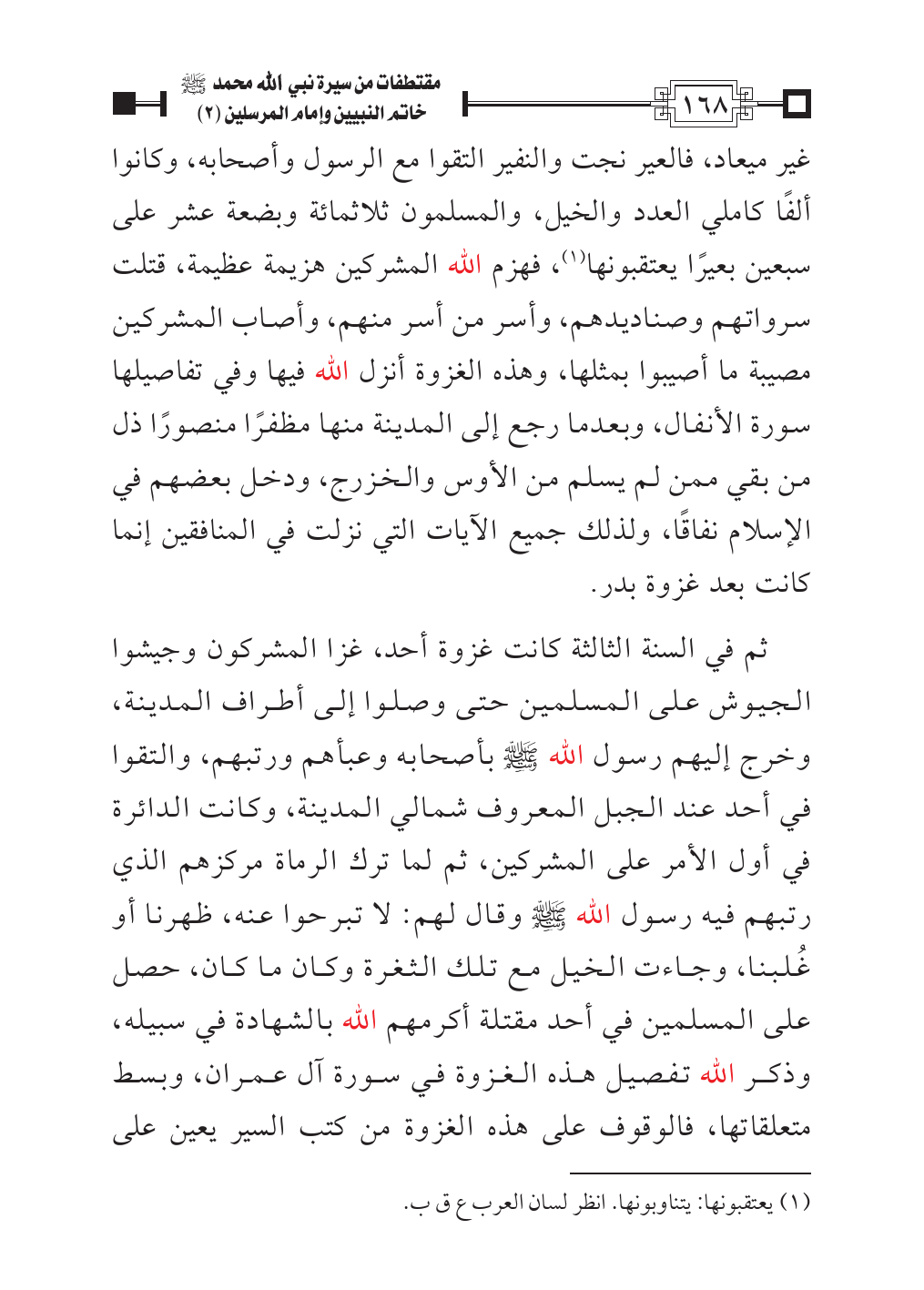 غير ميعاد، فالعير نجت والنفير التقوا مع الرسول وأصحابه، وكانوا ألفًا كاملي العدد والخيل، والمسلمون ثلاثمائة وبضعة عشر على سبعين بعيرًا يعتقبونها (¬١)، فهزم الله المشركين هزيمة عظيمة، قتلت سرواتهم وصناديدهم، وأسر من أسر منهم، وأصاب المشركين مصيبة ما أصيبوا بمثلها، وهذه الغزوة أنزل الله فيها وفي تفاصيلها سورة الأنفال، وبعدما رجع إلى المدينة منها مظفرًا منصورًا ذل من بقي ممن لم يسلم من الأوس والخزرج، ودخل بعضهم في الإسلام نفاقًا، ولذلك جميع الآيات التي نزلت في المنافقين إنما كانت بعد غزوة بدر.