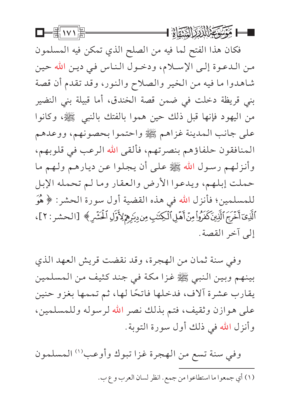 وفي سنة ثمان من الهجرة، وقد نقضت قريش العهد الذي بينهم وبين النبي - صلى الله عليه وسلم - غزا مكة في جند كثيف من المسلمين يقارب عشرة آلاف، فدخلها فاتحًا لها، ثم تممها بغزو حنين على هوازن وثقيف، فتم بذلك نصر الله لرسوله وللمسلمين، وأنزل الله في ذلك أول سورة التوبة.
