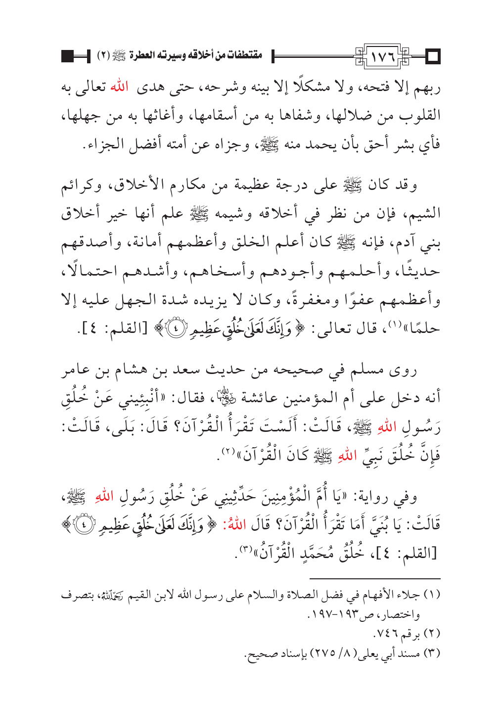 روى مسلم في صحيحه من حديث سعد بن هشام بن عامر أنه دخل على أم المؤمنين عائشة - رضي الله عنها -، فقال: «أنْبِئِيني عَنْ خُلُقِ رَسُولِ اللهِ - صلى الله عليه وسلم -، قَالَتْ: أَلَسْتَ تَقْرَأُ الْقُرْآنَ؟ قَالَ: بَلَى، قَالَتْ: فَإِنَّ خُلُقَ نَبِيِّ اللهِ - صلى الله عليه وسلم - كَانَ الْقُرْآنَ» (¬٢).