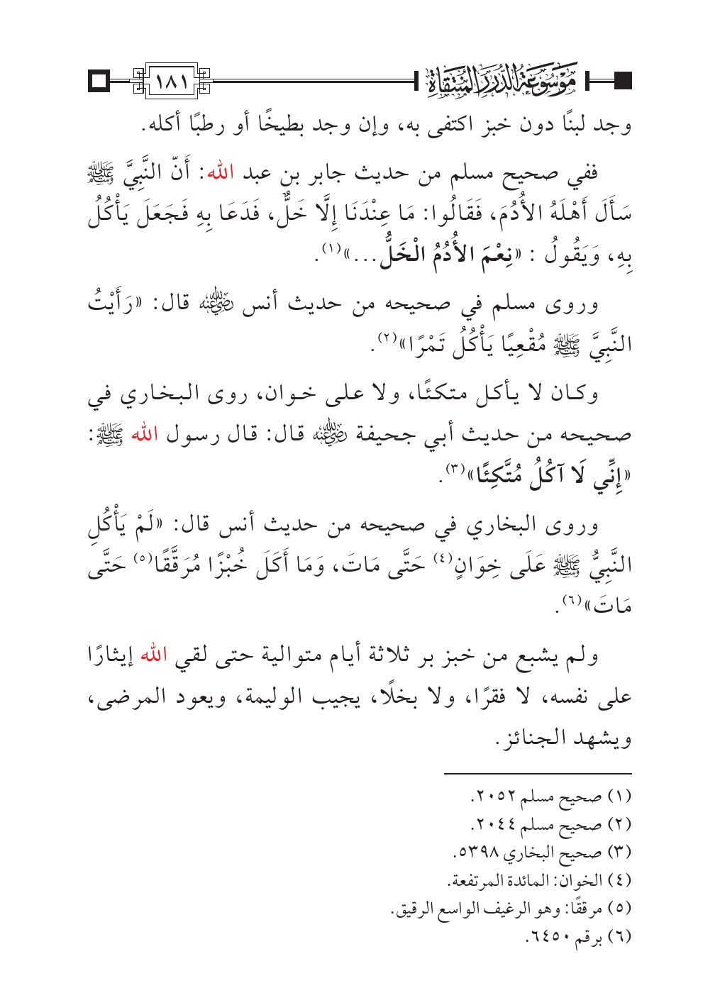 وروى البخاري في صحيحه من حديث أنس قال: «لَمْ يَأْكُلِ النَّبِيُّ - صلى الله عليه وسلم - عَلَى خِوَانٍ (¬٤) حَتَّى مَاتَ، وَمَا أَكَلَ خُبْزًا مُرَقَّقًا (¬٥) حَتَّى مَاتَ» (¬٦).