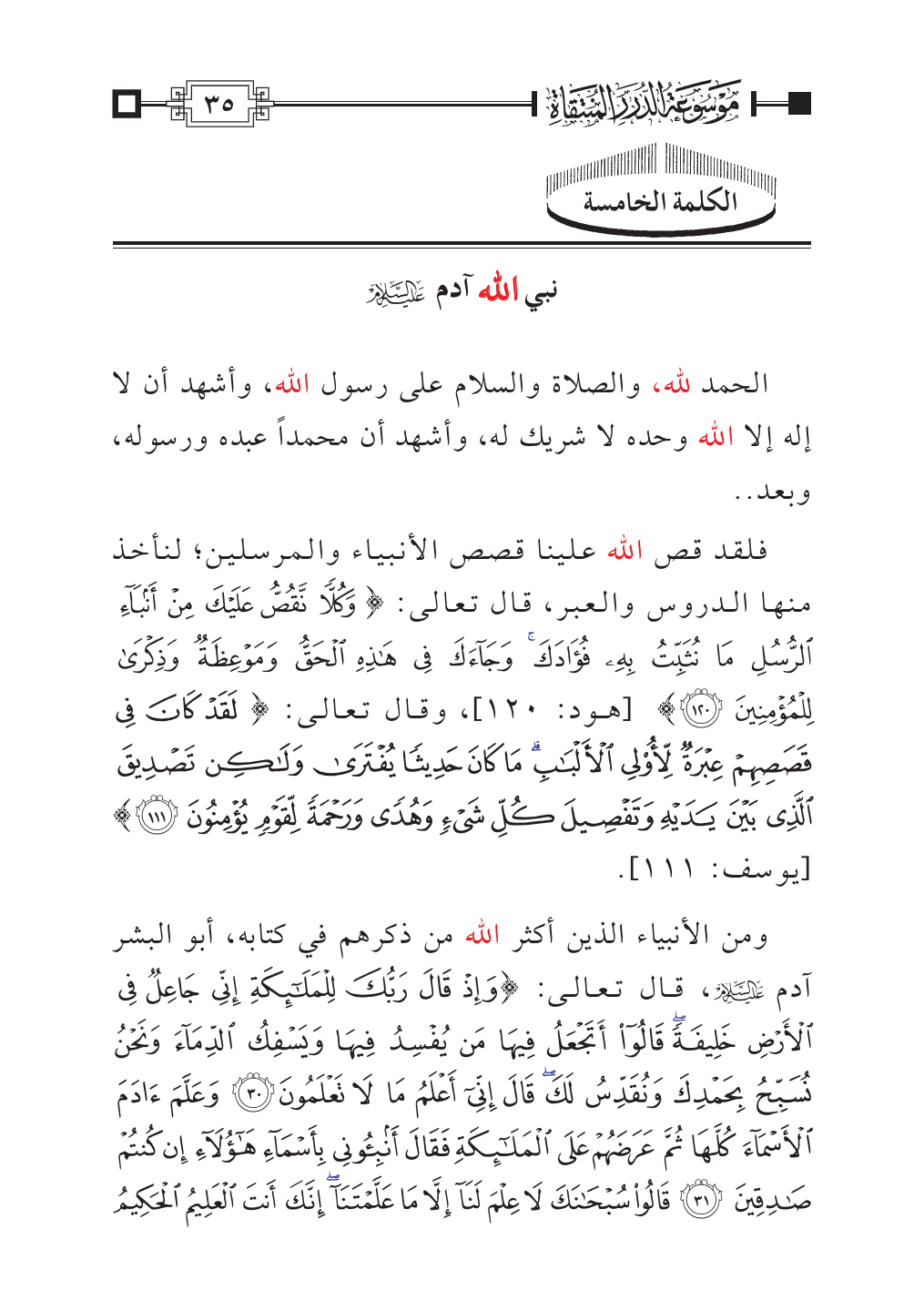 ومن الأنبياء الذين أكثر الله من ذكرهم في كتابه، أبو البشر آدم عليه السلام، قال تعالى: {وَإِذْ قَالَ رَبُّكَ لِلْمَلَائِكَةِ إِنِّي جَاعِلٌ فِي الْأَرْضِ خَلِيفَةً قَالُوا أَتَجْعَلُ فِيهَا مَنْ يُفْسِدُ فِيهَا وَيَسْفِكُ الدِّمَاءَ وَنَحْنُ نُسَبِّحُ بِحَمْدِكَ وَنُقَدِّسُ لَكَ قَالَ إِنِّي أَعْلَمُ مَا لَا تَعْلَمُونَ (٣٠) وَعَلَّمَ آدَمَ الْأَسْمَاءَ كُلَّهَا ثُمَّ عَرَضَهُمْ عَلَى الْمَلَائِكَةِ فَقَالَ أَنْبِئُونِي بِأَسْمَاءِ هَؤُلَاءِ إِنْ كُنْتُمْ صَادِقِينَ (٣١) قَالُوا سُبْحَانَكَ لَا عِلْمَ لَنَا إِلَّا مَا عَلَّمْتَنَا إِنَّكَ أَنْتَ الْعَلِيمُ الْحَكِيمُ