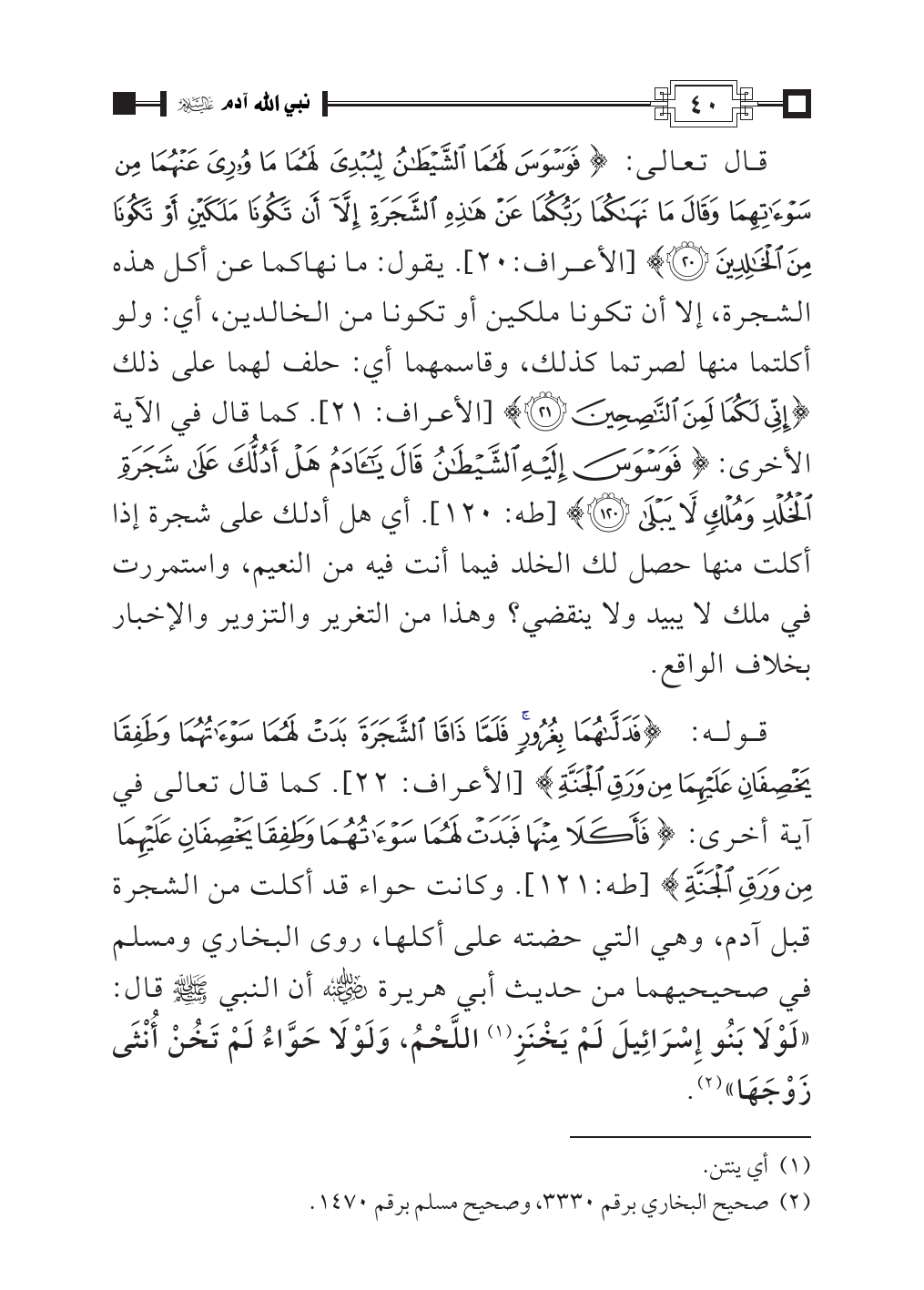 قال تعالى: {فَوَسْوَسَ لَهُمَا الشَّيْطَانُ لِيُبْدِيَ لَهُمَا مَا وُورِيَ عَنْهُمَا مِنْ سَوْآتِهِمَا وَقَالَ مَا نَهَاكُمَا رَبُّكُمَا عَنْ هَذِهِ الشَّجَرَةِ إِلَّا أَنْ تَكُونَا مَلَكَيْنِ أَوْ تَكُونَا مِنَ الْخَالِدِينَ (٢٠)} [الأعراف:٢٠]. يقول: ما نهاكما عن أكل هذه الشجرة، إلا أن تكونا ملكين أو تكونا من الخالدين، أي: ولو أكلتما منها لصرتما كذلك، وقاسمهما أي: حلف لهما على ذلك {إِنِّي لَكُمَا لَمِنَ النَّاصِحِينَ (٢١)} [الأعراف: ٢١]. كما قال في الآية الأخرى: {فَوَسْوَسَ إِلَيْهِ الشَّيْطَانُ قَالَ يَاآدَمُ هَلْ أَدُلُّكَ عَلَى شَجَرَةِ الْخُلْدِ وَمُلْكٍ لَا يَبْلَى (١٢٠)} [طه: ١٢٠]. أي هل أدلك على شجرة إذا أكلت منها حصل لك الخلد فيما أنت فيه من النعيم، واستمررت في ملك لا يبيد ولا ينقضي؟ وهذا من التغرير والتزوير والإخبار بخلاف الواقع.