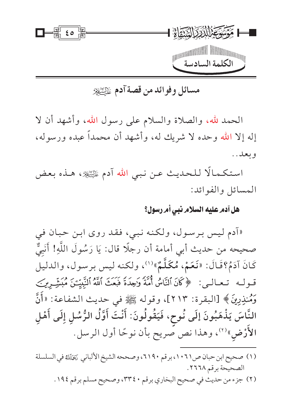 «آدم ليس برسول، ولكنه نبي، فقد روى ابن حبان في صحيحه من حديث أبي أمامة أن رجلًا قال: يَا رَسُولَ اللَّهِ! أَنَبِيٌّ كَانَ آدَمُ؟ قَالَ: «نَعَمْ، مُكَلَّمٌ» (¬١)، ولكنه ليس برسول، والدليل قوله تعالى: {كَانَ النَّاسُ أُمَّةً وَاحِدَةً فَبَعَثَ اللَّهُ النَّبِيِّينَ مُبَشِّرِينَ وَمُنْذِرِينَ} [البقرة: ٢١٣]، وقوله - صلى الله عليه وسلم - في حديث الشفاعة: «أَنَّ النَّاسَ يَذْهَبُونَ إلَى نُوحٍ، فَيَقُولُونَ: أَنْتَ أَوَّلُ الرُّسُلِ إِلَى أَهْلِ الأَرْضِ» (¬٢)، وهذا نص صريح بأن نوحًا أول الرسل.