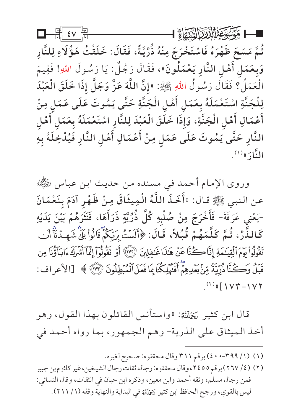 وروى الإمام أحمد في مسنده من حديث ابن عباس - رضي الله عنه - عن النبي - صلى الله عليه وسلم - قال: «أَخَذَ اللَّهُ الْمِيثَاقَ مِنْ ظَهْرِ آدَمَ بِنَعْمَانَ -يَعْنِي عَرَفَةَ- فَأَخْرَجَ مِنْ صُلْبِهِ كُلَّ ذُرِّيَّةٍ ذَرَأَهَا، فَنَثَرَهُمْ بَيْنَ يَدَيْهِ كَالذَّرِّ، ثُمَّ كَلَّمَهُمْ قُبُلاً، قَالَ: {أَلَسْتُ بِرَبِّكُمْ قَالُوا بَلَى شَهِدْنَا أَنْ تَقُولُوا يَوْمَ الْقِيَامَةِ إِنَّا كُنَّا عَنْ هَذَا غَافِلِينَ (١٧٢) أَوْ تَقُولُوا إِنَّمَا أَشْرَكَ آبَاؤُنَا مِنْ قَبْلُ وَكُنَّا ذُرِّيَّةً مِنْ بَعْدِهِمْ أَفَتُهْلِكُنَا بِمَا فَعَلَ (١٧٣)} [الأعراف: ١٧٢ - ١٧٣]» (¬٢).