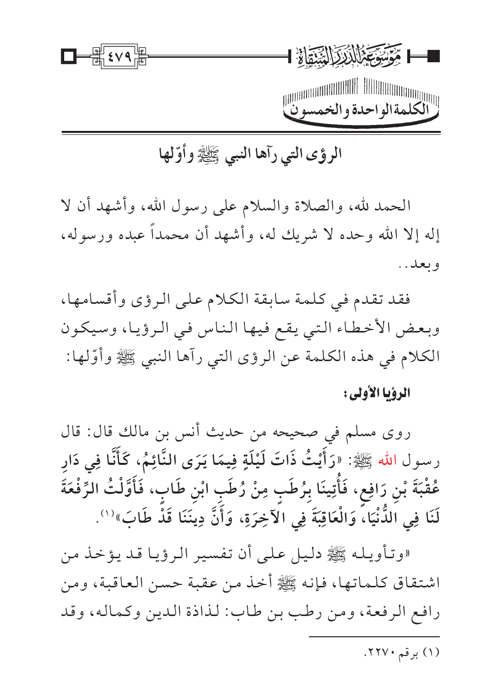 فقد تقدم في كلمة سابقة الكلام على الرؤى وأقسامها، وبعض الأخطاء التي يقع فيها الناس في الرؤيا، وسيكون الكلام في هذه الكلمة عن الرؤى التي رآها النبي - صلى الله عليه وسلم - وأوّلها: