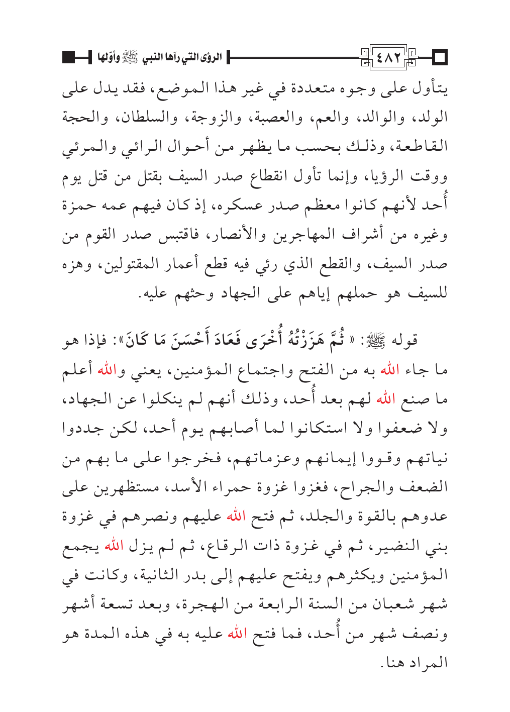 يتأول على وجوه متعددة في غير هذا الموضع، فقد يدل على الولد، والوالد، والعم، والعصبة، والزوجة، والسلطان، والحجة القاطعة، وذلك بحسب ما يظهر من أحوال الرائي والمرئي ووقت الرؤيا، وإنما تأول انقطاع صدر السيف بقتل من قتل يوم أُحد لأنهم كانوا معظم صدر عسكره، إذ كان فيهم عمه حمزة وغيره من أشراف المهاجرين والأنصار، فاقتبس صدر القوم من صدر السيف، والقطع الذي رئي فيه قطع أعمار المقتولين، وهزه للسيف هو حملهم إياهم على الجهاد وحثهم عليه.
