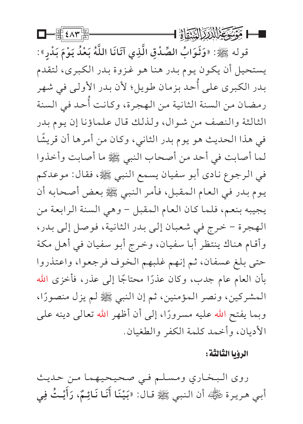 قوله - صلى الله عليه وسلم -: «وَثَوَابُ الصِّدْقِ الَّذِي آتَانَا اللَّهُ بَعْدُ يَوْمَ بَدْرٍ»: يستحيل أن يكون يوم بدر هنا هو غزوة بدر الكبرى، لتقدم بدر الكبرى على أُحد بزمان طويل؛ لأن بدر الأولى في شهر رمضان من السنة الثانية من الهجرة، وكانت أُحد في السنة الثالثة والنصف من شوال، ولذلك قال علماؤنا إن يوم بدر في هذا الحديث هو يوم بدر الثاني، وكان من أمرها أن قريشًا لما أصابت في أحد من أصحاب النبي - صلى الله عليه وسلم - ما أصابت وأخذوا في الرجوع نادى أبو سفيان يسمع النبي - صلى الله عليه وسلم -، فقال: موعدكم يوم بدر في العام المقبل، فأمر النبي - صلى الله عليه وسلم - بعض أصحابه أن يجيبه بنعم، فلما كان العام المقبل - وهي السنة الرابعة من الهجرة - خرج في شعبان إلى بدر الثانية، فوصل إلى بدر، وأقام هناك ينتظر أبا سفيان، وخرج أبو سفيان في أهل مكة حتى بلغ عسفان، ثم إنهم غلبهم الخوف فرجعوا، واعتذروا بأن العام عام جدب، وكان عذرًا محتاجًا إلى عذر، فأخزى الله المشركين، ونصر المؤمنين، ثم إن النبي - صلى الله عليه وسلم - لم يزل منصورًا، وبما يفتح الله عليه مسرورًا، إلى أن أظهر الله تعالى دينه على الأديان، وأخمد كلمة الكفر والطغيان.