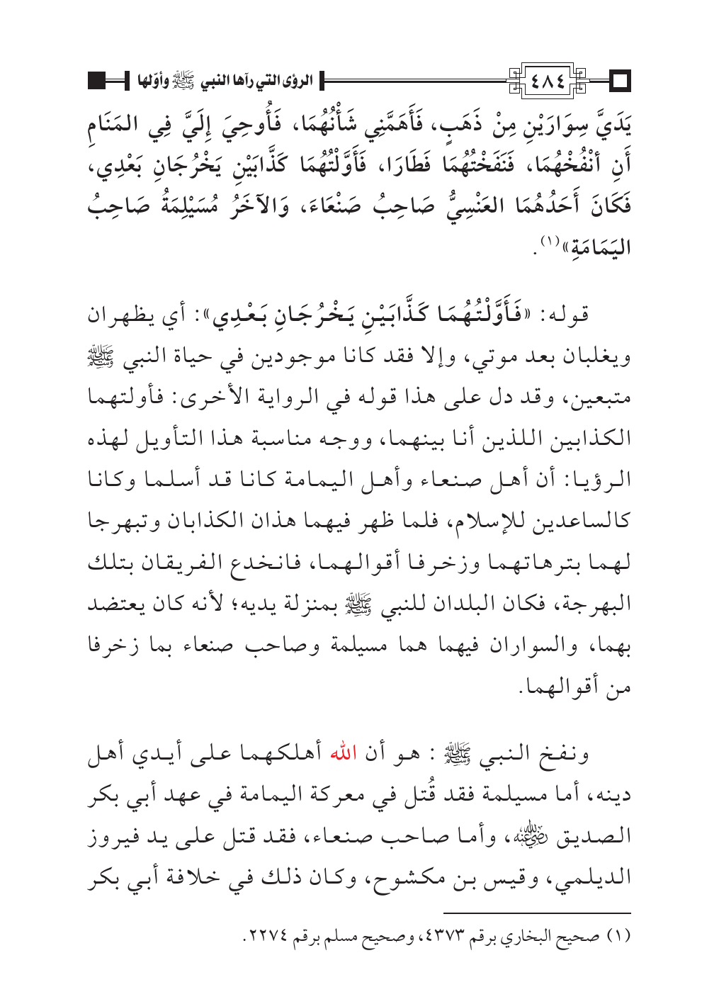 يَدَيَّ سِوَارَيْنِ مِنْ ذَهَبٍ، فَأَهَمَّنِي شَأْنُهُمَا، فَأُوحِيَ إِلَيَّ فِي المَنَامِ أَنِ أنْفُخْهُمَا، فَنَفَخْتُهُمَا فَطَارَا، فَأَوَّلْتُهُمَا كَذَّابَيْنِ يَخْرُجَانِ بَعْدِي، فَكَانَ أَحَدُهُمَا العَنْسِيُّ صَاحِبُ صَنْعَاءَ، وَالآخَرُ مُسَيْلِمَةُ صَاحِبُ اليَمَامَةِ» (¬١).