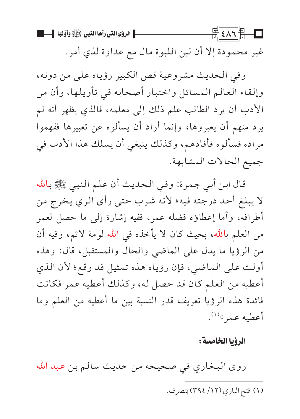 قال ابن أبي جمرة: وفي الحديث أن علم النبي - صلى الله عليه وسلم - بالله لا يبلغ أحد درجته فيه؛ لأنه شرب حتى رأى الري يخرج من أطرافه، وأما إعطاؤه فضله عمر، ففيه إشارة إلى ما حصل لعمر من العلم بالله، بحيث كان لا يأخذه في الله لومة لائم، وفيه أن من الرؤيا ما يدل على الماضي والحال والمستقبل، قال: وهذه أولت على الماضي، فإن رؤياه هذه تمثيل قد وقع؛ لأن الذي أعطيه من العلم كان قد حصل له، وكذلك أعطيه عمر فكانت فائدة هذه الرؤيا تعريف قدر النسبة بين ما أعطيه من العلم وما أعطيه عمر» (¬١).