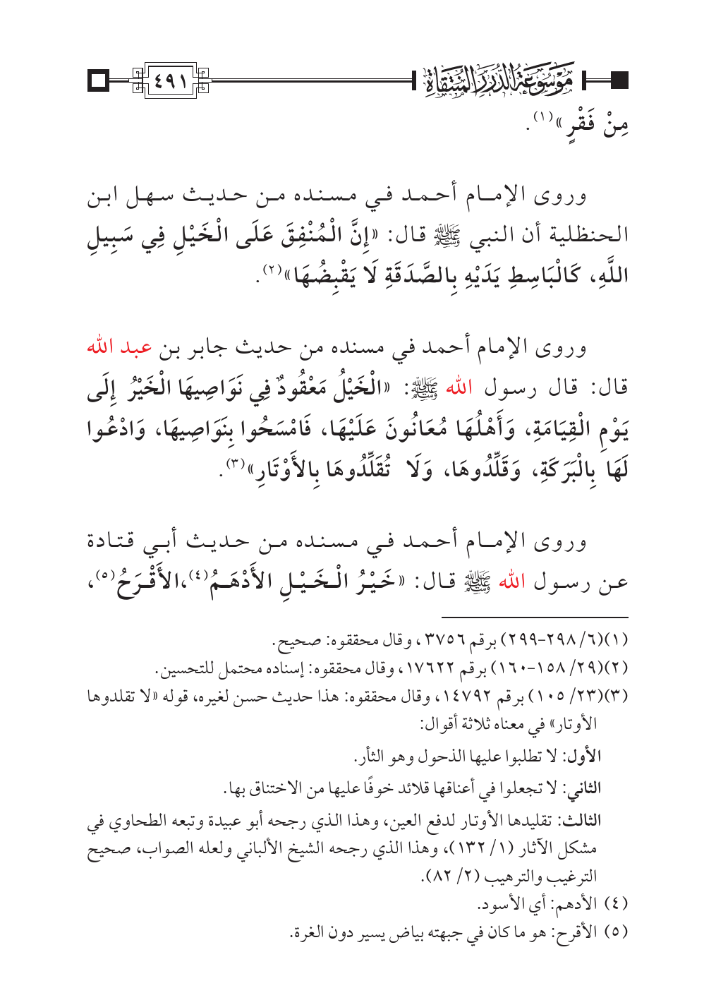 وروى الإمام أحمد في مسنده من حديث جابر بن عبد الله قال: قال رسول الله - صلى الله عليه وسلم -: «الْخَيْلُ مَعْقُودٌ فِي نَوَاصِيهَا الْخَيْرُ إِلَى يَوْمِ الْقِيَامَةِ، وَأَهْلُهَا مُعَانُونَ عَلَيْهَا، فَامْسَحُوا بِنَوَاصِيهَا، وَادْعُوا لَهَا بِالْبَرَكَةِ، وَقَلِّدُوهَا، وَلَا تُقَلِّدُوهَا بِالأَوْتَارِ» (¬٣).