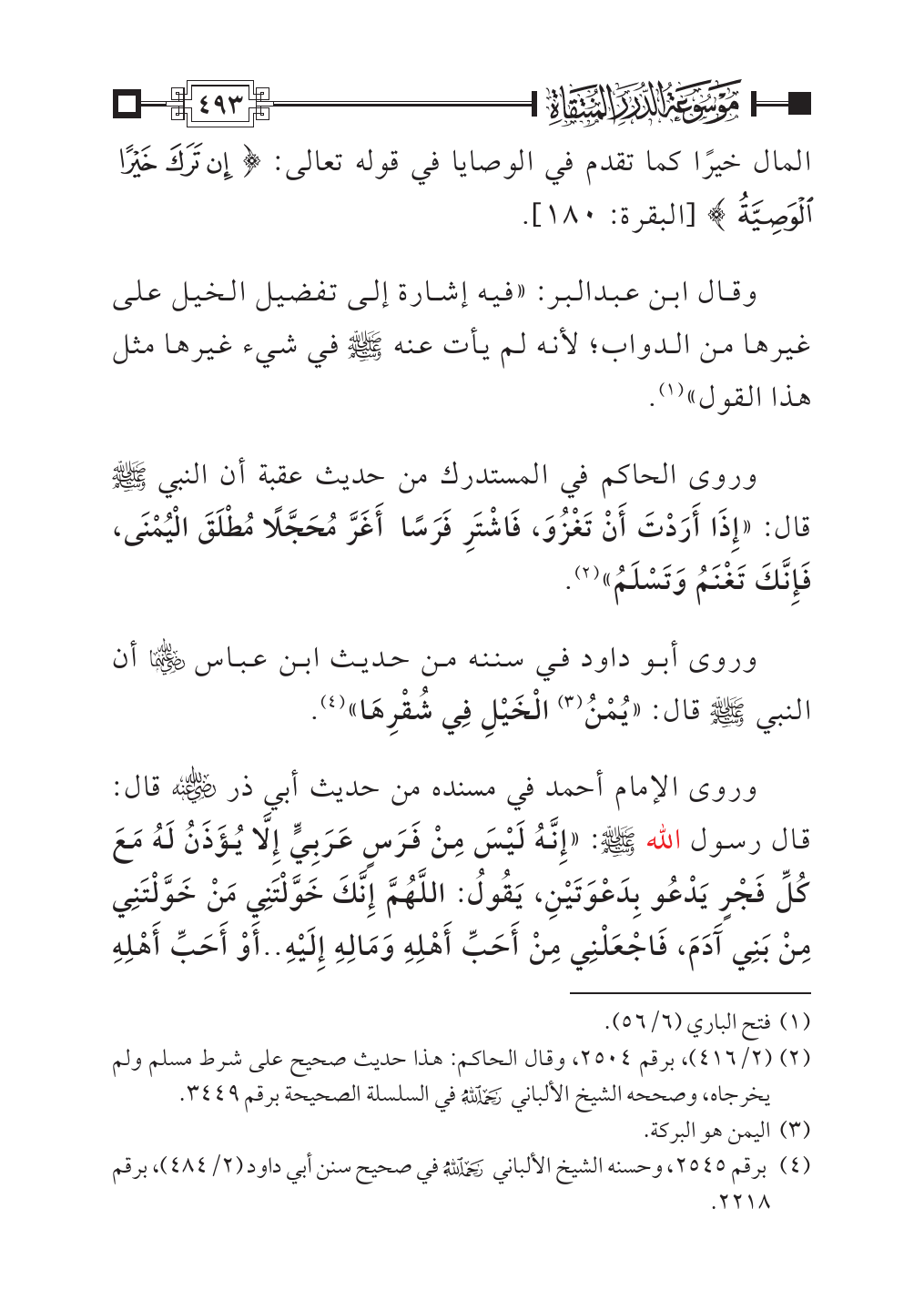 وقال ابن عبدالبر: «فيه إشارة إلى تفضيل الخيل على غيرها من الدواب؛ لأنه لم يأت عنه - صلى الله عليه وسلم - في شيء غيرها مثل هذا القول» (¬١).