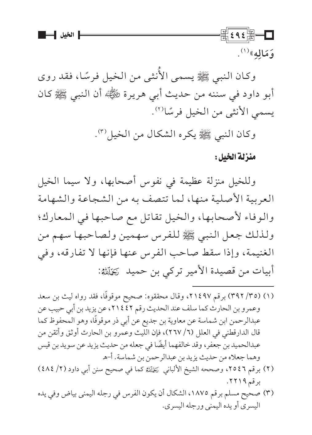 (¬٣) صحيح مسلم برقم ١٨٧٥، الشكال أن يكون الفرس في رجله اليمنى بياض وفي يده اليسرى أو يده اليمنى ورجله اليسرى.