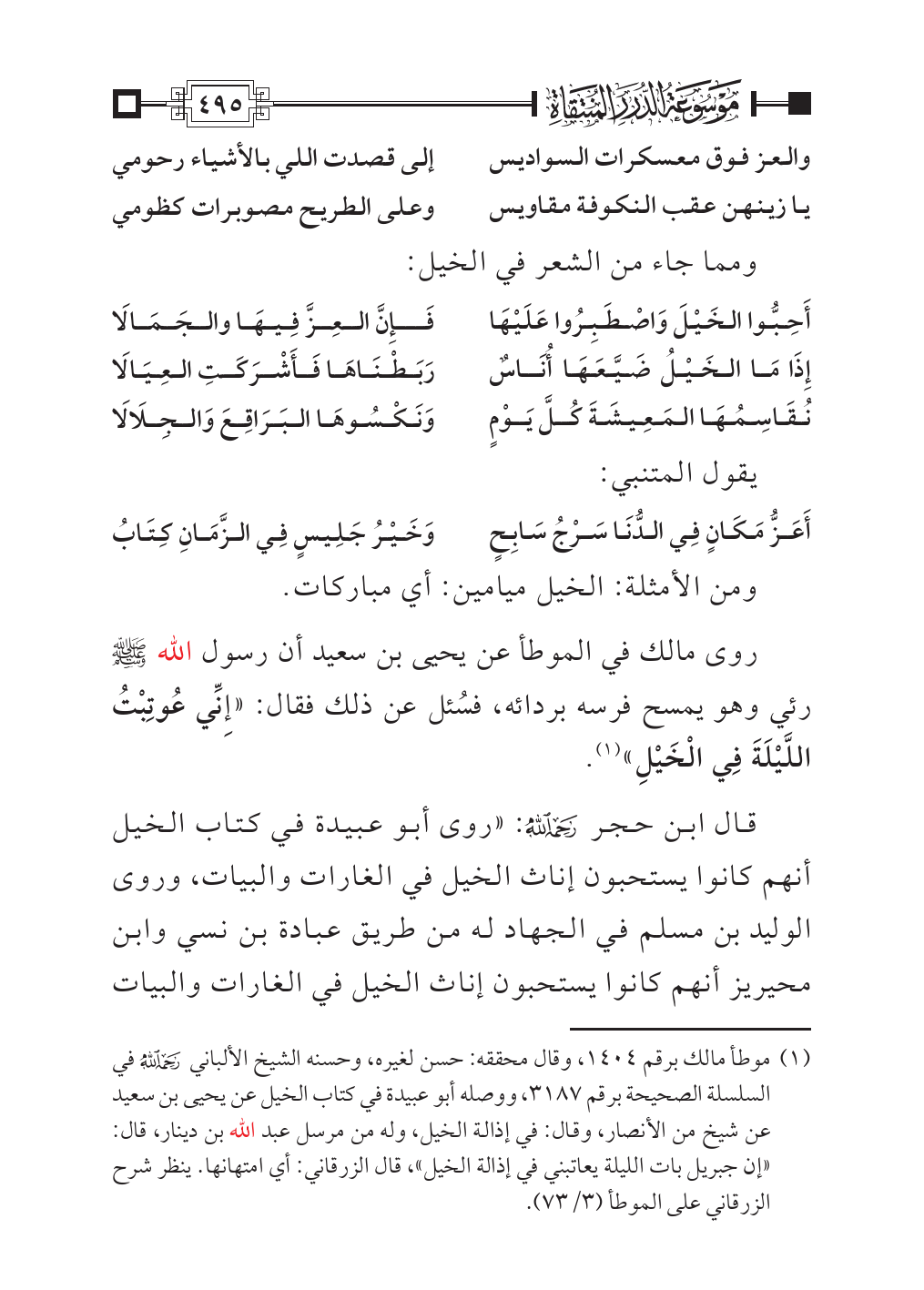 (¬١) موطأ مالك برقم ١٤٠٤، وقال محققه: حسن لغيره، وحسنه الشيخ الألباني - رحمه الله - في السلسلة الصحيحة برقم ٣١٨٧، ووصله أبو عبيدة في كتاب الخيل عن يحيى بن سعيد عن شيخ من الأنصار، وقال: في إذالة الخيل، وله من مرسل عبد الله بن دينار، قال: «إن جبريل بات الليلة يعاتبني في إذالة الخيل»، قال الزرقاني: أي امتهانها. ينظر شرح الزرقاني على الموطأ (٣/ ٧٣).
