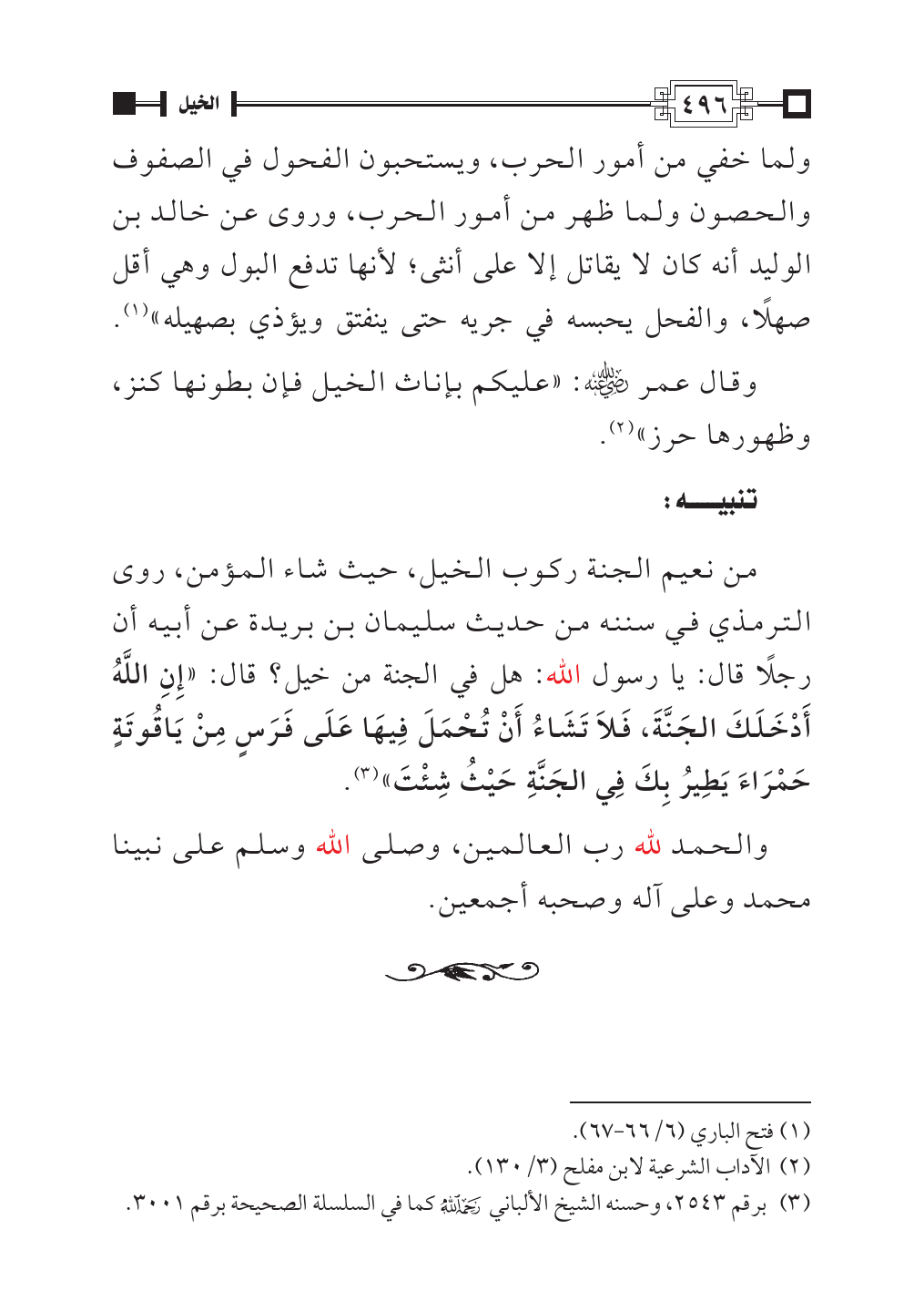 وقال عمر - رضي الله عنه -: «عليكم بإناث الخيل فإن بطونها كنز، وظهورها حرز» (¬٢).