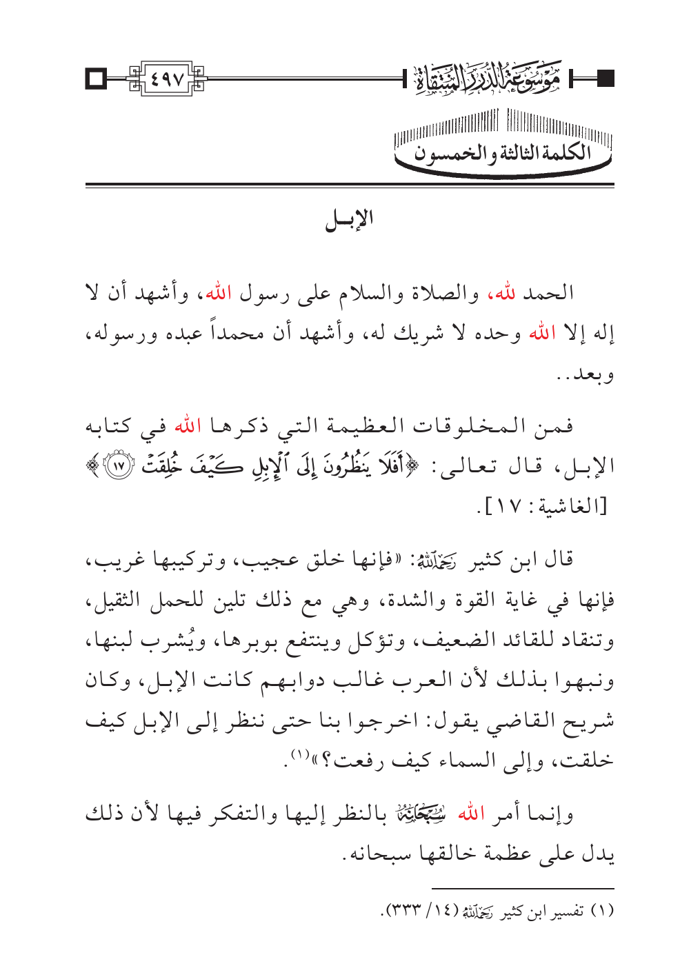 فمن المخلوقات العظيمة التي ذكرها الله في كتابه الإبل، قال تعالى: {أَفَلَا يَنْظُرُونَ إِلَى الْإِبِلِ كَيْفَ خُلِقَتْ (١٧)} [الغاشية:١٧].
