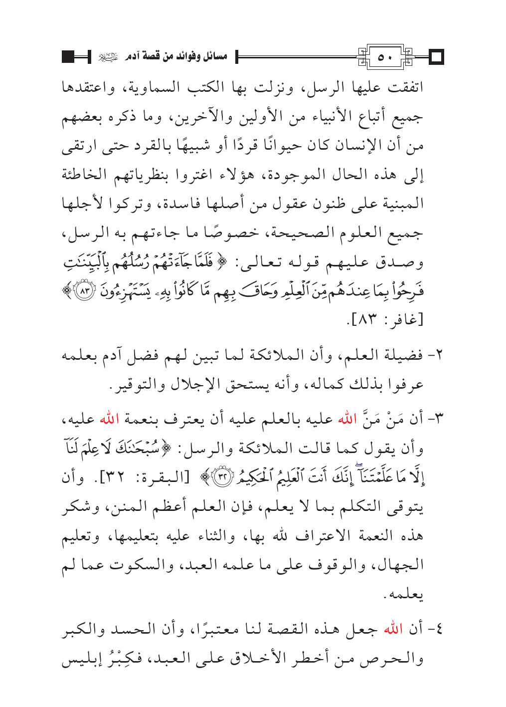 اتفقت عليها الرسل، ونزلت بها الكتب السماوية، واعتقدها جميع أتباع الأنبياء من الأولين والآخرين، وما ذكره بعضهم من أن الإنسان كان حيوانًا قردًا أو شبيهًا بالقرد حتى ارتقى إلى هذه الحال الموجودة، هؤلاء اغتروا بنظرياتهم الخاطئة المبنية على ظنون عقول من أصلها فاسدة، وتركوا لأجلها جميع العلوم الصحيحة، خصوصًا ما جاءتهم به الرسل، وصدق عليهم قوله تعالى: {فَلَمَّا جَاءَتْهُمْ رُسُلُهُمْ بِالْبَيِّنَاتِ فَرِحُوا بِمَا عِنْدَهُمْ مِنَ الْعِلْمِ وَحَاقَ بِهِمْ مَا كَانُوا بِهِ يَسْتَهْزِئُونَ (٨٣)} [غافر: ٨٣].