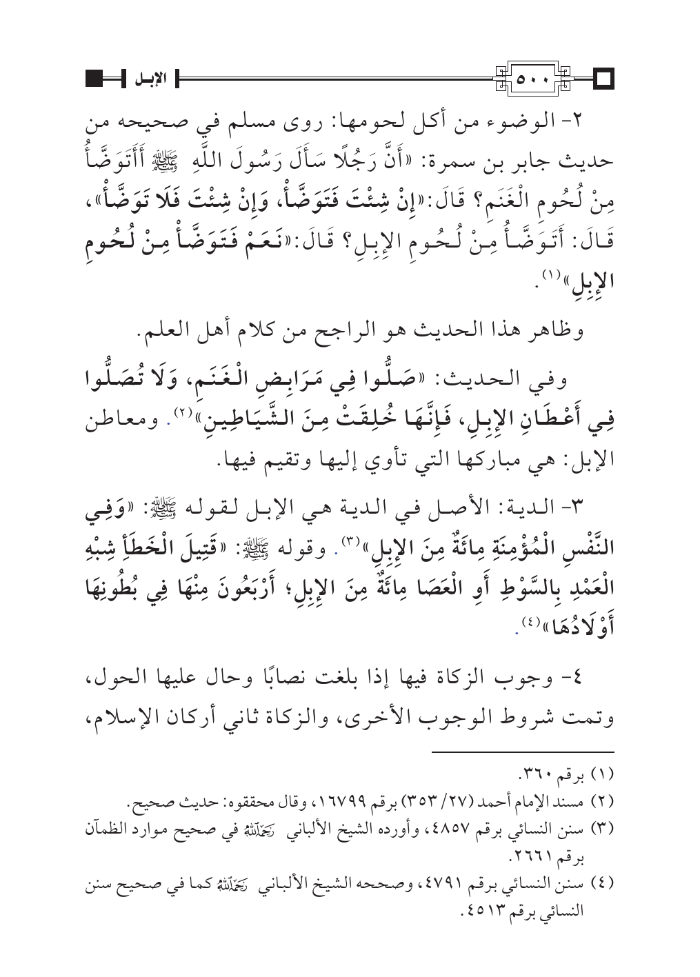 ٢ - الوضوء من أكل لحومها: روى مسلم في صحيحه من حديث جابر بن سمرة: «أَنَّ رَجُلًا سَأَلَ رَسُولَ اللَّهِ - صلى الله عليه وسلم - أَأَتَوَضَّأُ مِنْ لُحُومِ الْغَنَمِ؟ قَالَ: «إِنْ شِئْتَ فَتَوَضَّأْ، وَإِنْ شِئْتَ فَلَا تَوَضَّأْ»، قَالَ: أَتَوَضَّأُ مِنْ لُحُومِ الإِبِلِ؟ قَالَ: «نَعَمْ فَتَوَضَّأْ مِنْ لُحُومِ الإِبِلِ» (¬١).