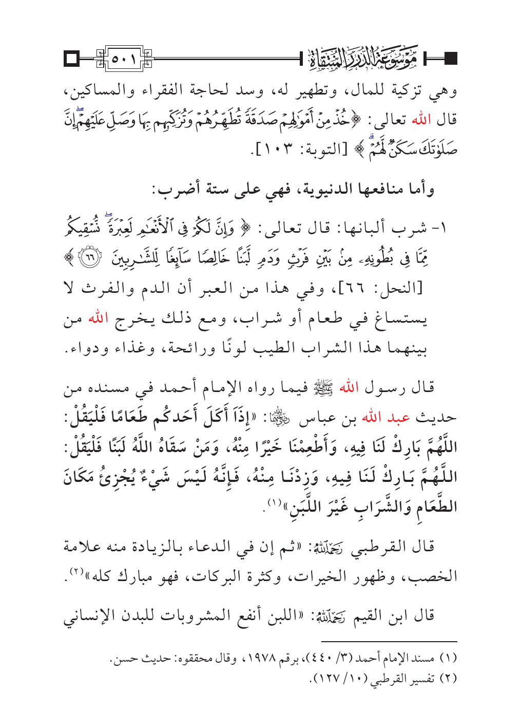 قال ابن القيم - رحمه الله -: «اللبن أنفع المشروبات للبدن الإنساني