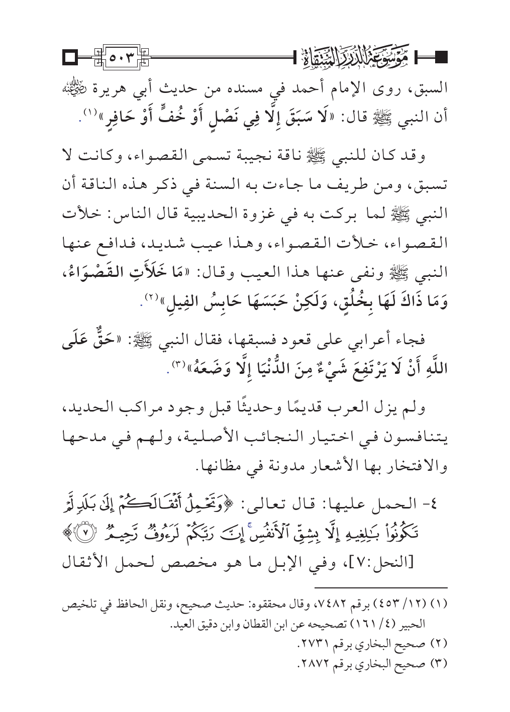 وقد كان للنبي - صلى الله عليه وسلم - ناقة نجيبة تسمى القصواء، وكانت لا تسبق، ومن طريف ما جاءت به السنة في ذكر هذه الناقة أن النبي - صلى الله عليه وسلم - لما بركت به في غزوة الحديبية قال الناس: خلأت القصواء، خلأت القصواء، وهذا عيب شديد، فدافع عنها النبي - صلى الله عليه وسلم - ونفى عنها هذا العيب وقال: «مَا خَلَأَتِ القَصْوَاءُ، وَمَا ذَاكَ لَهَا بِخُلُقٍ، وَلَكِنْ حَبَسَهَا حَابِسُ الفِيلِ» (¬٢).