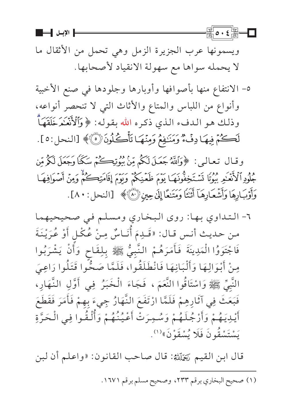 ٦ - التداوي بها: روى البخاري ومسلم في صحيحيهما من حديث أنس قال: «قَدِمَ أُنَاسٌ مِنْ عُكْلٍ أَوْ عُرَيْنَةَ فَاجْتَوَوُا الْمَدِينَةَ فَأَمَرَهُمْ النَّبِيُّ - صلى الله عليه وسلم - بِلِقَاحٍ وَأَنْ يَشْرَبُوا مِنْ أَبْوَالِهَا وَأَلْبَانِهَا فَانْطَلَقُوا، فَلَمَّا صَحُّوا قَتَلُوا رَاعِيَ النَّبِيِّ - صلى الله عليه وسلم - وَاسْتَاقُوا النَّعَمَ، فَجَاءَ الْخَبَرُ فِي أَوَّلِ النَّهَارِ، فَبَعَثَ فِي آثَارِهِمْ فَلَمَّا ارْتَفَعَ النَّهَارُ جِيءَ بِهِمْ فَأَمَرَ فَقَطَعَ أَيْدِيَهُمْ وَأَرْجُلَهُمْ وَسُمِرَتْ أَعْيُنُهُمْ وَأُلْقُوا فِي الْحَرَّةِ يَسْتَسْقُونَ فَلَا يُسْقَوْنَ» (¬١).
