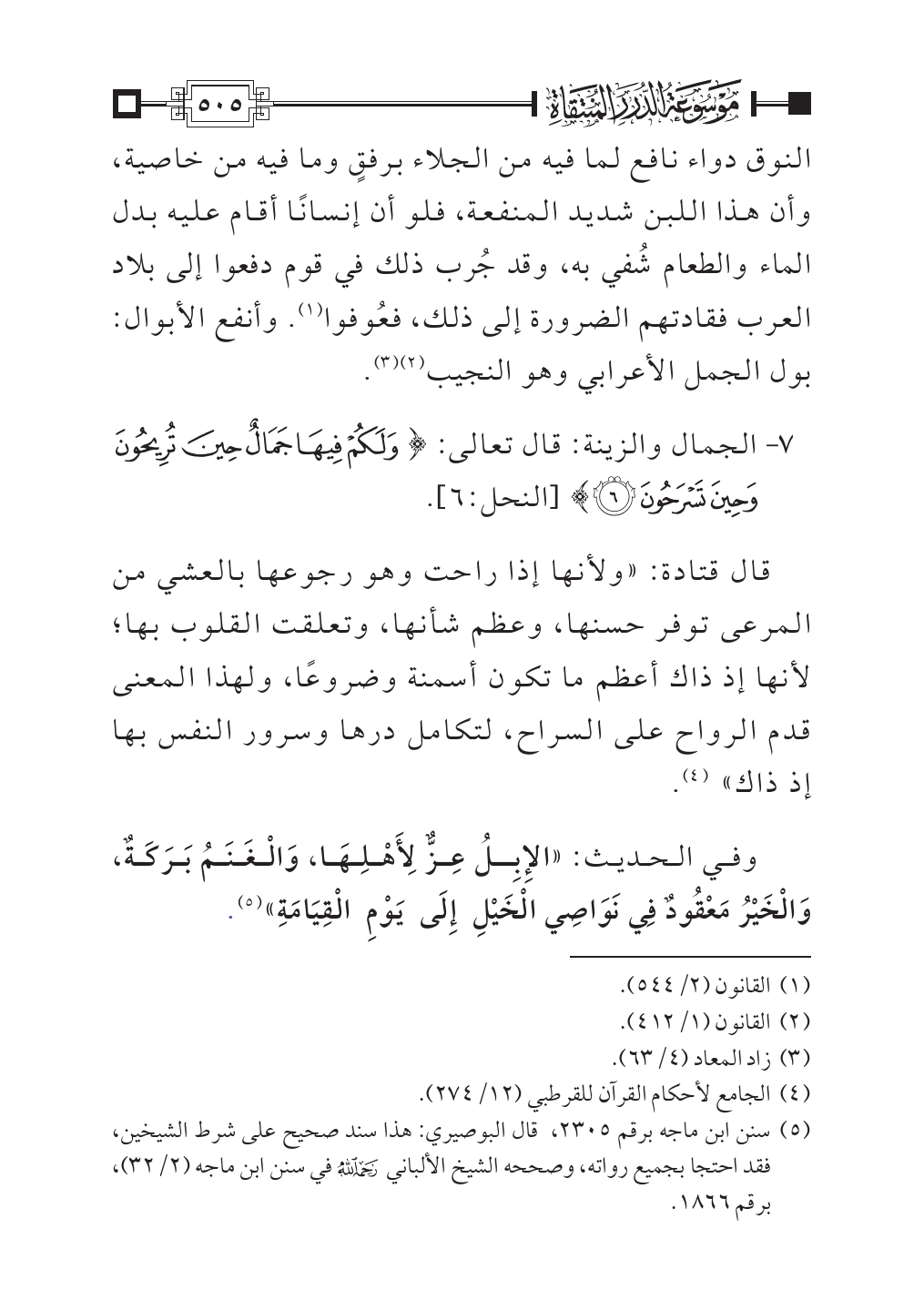 ٧ - الجمال والزينة: قال تعالى: {وَلَكُمْ فِيهَا جَمَالٌ حِينَ تُرِيحُونَ وَحِينَ تَسْرَحُونَ (٦)} [النحل:٦].