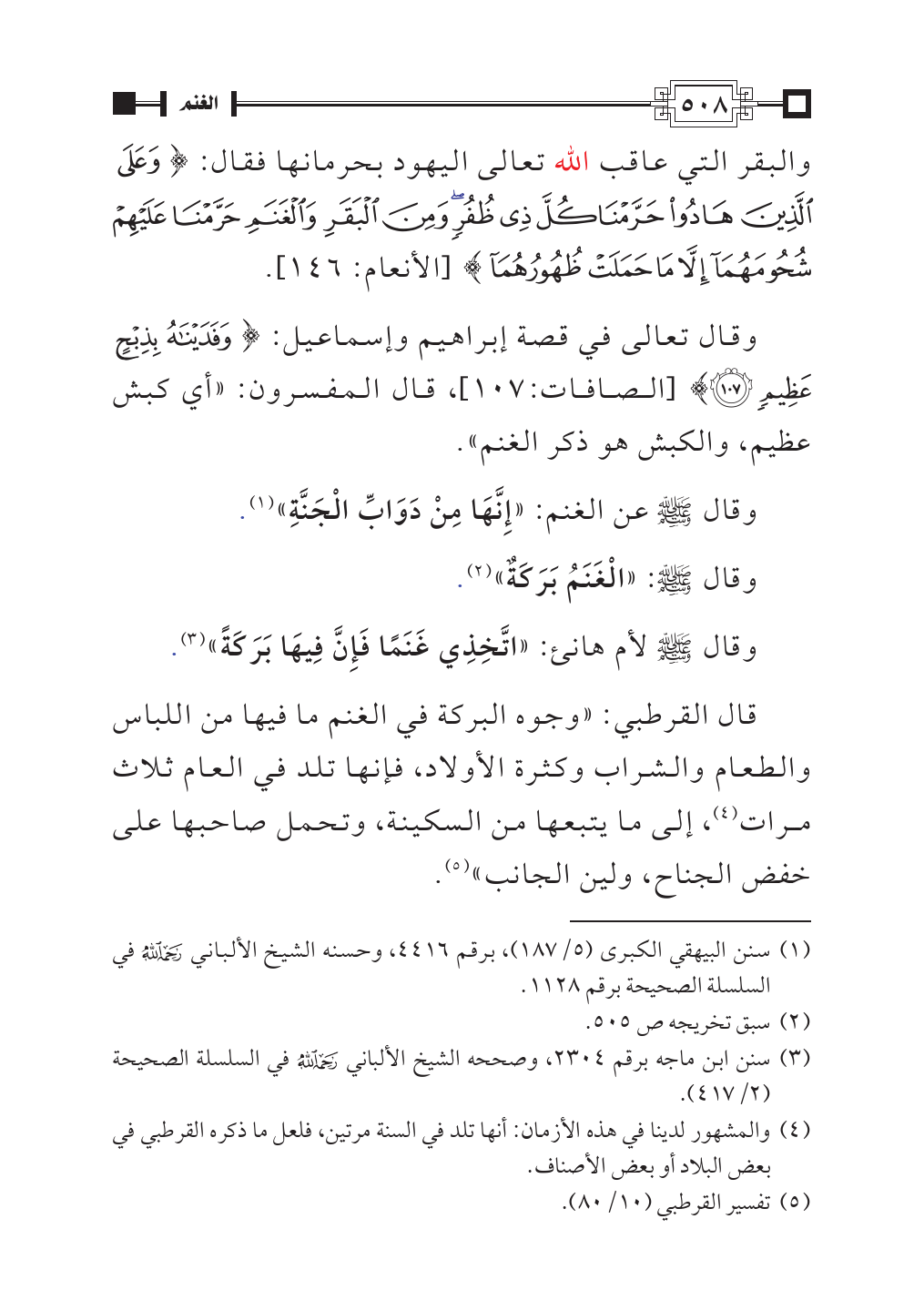 وقال - صلى الله عليه وسلم - عن الغنم: «إِنَّهَا مِنْ دَوَابِّ الْجَنَّةِ» (¬١).
