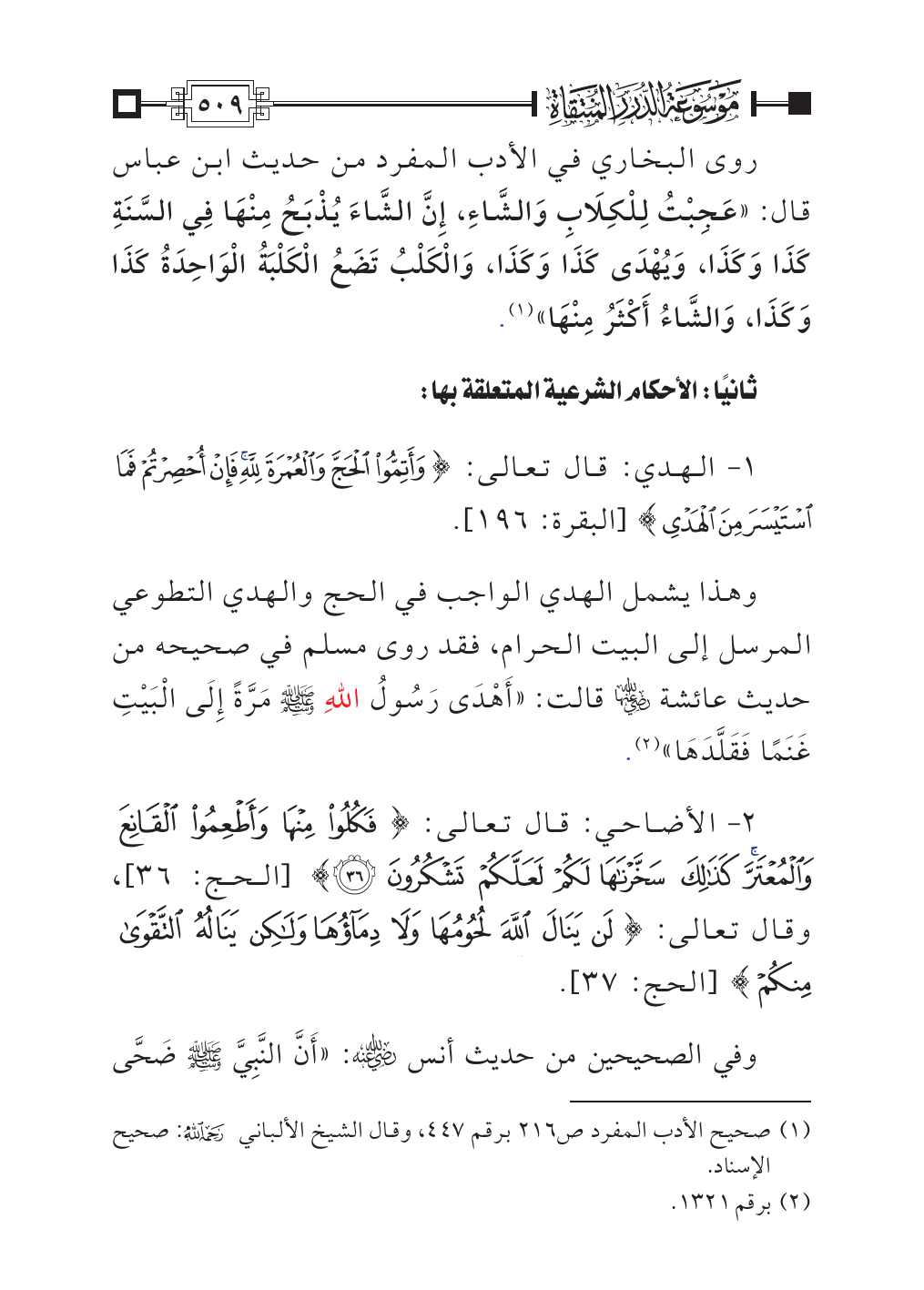 وهذا يشمل الهدي الواجب في الحج والهدي التطوعي المرسل إلى البيت الحرام، فقد روى مسلم في صحيحه من حديث عائشة - رضي الله عنها - قالت: «أَهْدَى رَسُولُ اللهِ - صلى الله عليه وسلم - مَرَّةً إِلَى الْبَيْتِ غَنَمًا فَقَلَّدَهَا» (¬٢).