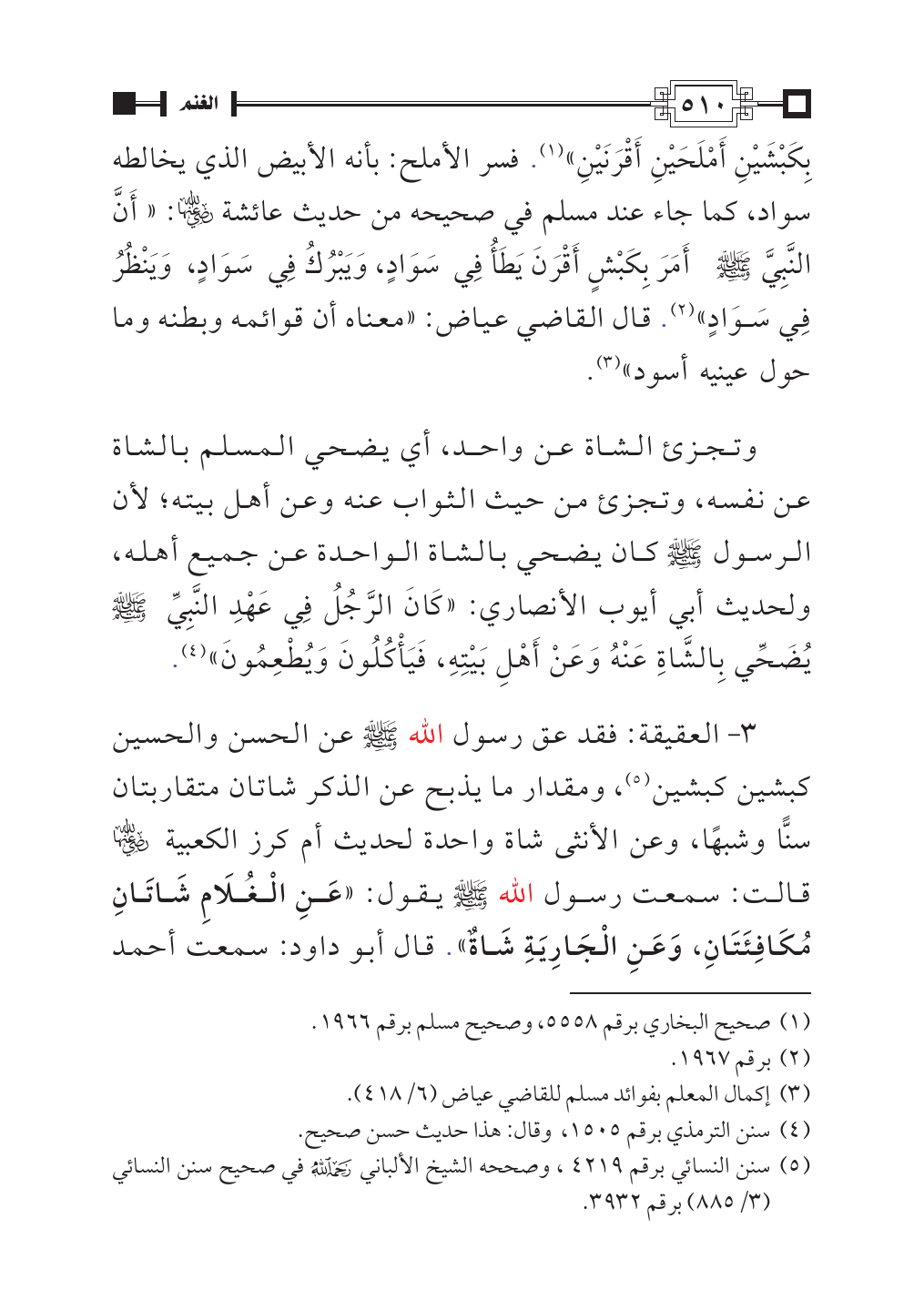 بِكَبْشَيْنِ أَمْلَحَيْنِ أَقْرَنَيْنِ» (¬١). فسر الأملح: بأنه الأبيض الذي يخالطه سواد، كما جاء عند مسلم في صحيحه من حديث عائشة - رضي الله عنها -: «أَنَّ النَّبِيَّ - صلى الله عليه وسلم - أَمَرَ بِكَبْشٍ أَقْرَنَ يَطَأُ فِي سَوَادٍ، وَيَبْرُكُ فِي سَوَادٍ، وَيَنْظُرُ فِي سَوَادٍ» (¬٢). قال القاضي عياض: «معناه أن قوائمه وبطنه وما حول عينيه أسود» (¬٣).