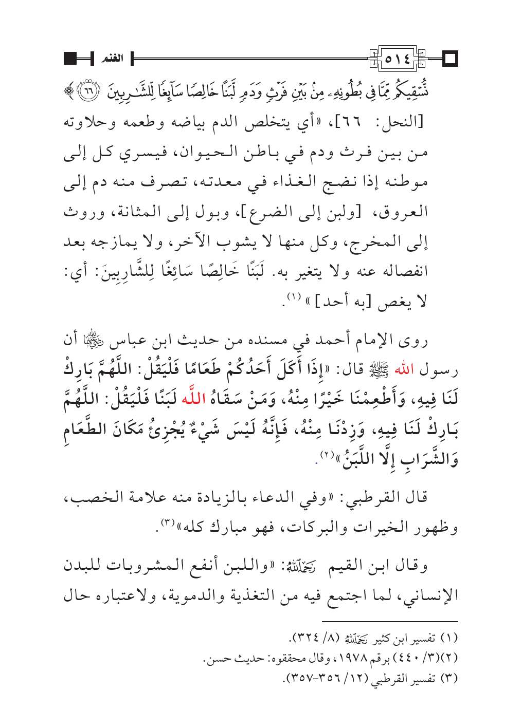 نُسْقِيكُمْ مِمَّا فِي بُطُونِهِ مِنْ بَيْنِ فَرْثٍ وَدَمٍ لَبَنًا خَالِصًا سَائِغًا لِلشَّارِبِينَ (٦٦)} [النحل: ٦٦]، «أي يتخلص الدم بياضه وطعمه وحلاوته من بين فرث ودم في باطن الحيوان، فيسري كل إلى موطنه إذا نضج الغذاء في معدته، تصرف منه دم إلى العروق،] ولبن إلى الضرع [، وبول إلى المثانة، وروث إلى المخرج، وكل منها لا يشوب الآخر، ولا يمازجه بعد انفصاله عنه ولا يتغير به. لَبَنًا خَالِصًا سَائِغًا لِلشَّارِبِينَ: أي: لا يغص] به أحد [» (¬١).