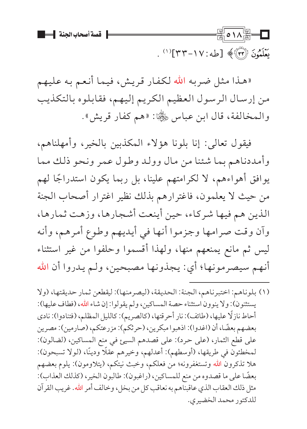 (¬١) بلوناهم: اختبرناهم، الجنة: الحديقة، (ليصرمنها): ليقطعن ثمار حديقتها، (ولا يستثنون): ولا ينوون استثناء حصة المساكين، ولم يقولوا: إن شاء الله، (فطاف عليها): أحاط نازلًا عليها، (طائف): نار أحرقتها، (كالصريم): كالليل المظلم، (فتنادوا): نادى بعضهم بعضًا، أن (اغدوا): اذهبوا مبكرين، (حرثكم): مزرعتكم، (صارمين): مصرين على قطع الثمار، (على حرد): على قصدهم السيئ في منع المساكين، (لضالون): لمخطئون في طريقها، (أوسطهم): أعدلهم، وخيرهم عقلًا ودينًا، (لولا تسبحون): هلا تذكرون الله وتستغفرونه؛ من فعلكم، وخبث نيتكم، (يتلاومون): يلوم بعضهم بعضًا على ما قصدوه من منع للمساكين، (راغبون): طالبون الخير، (كذلك العذاب): مثل ذلك العقاب الذي عاقبناهم به نعاقب كل من بخل، وخالف أمر الله. غريب القرآن للدكتور محمد الخضيري.