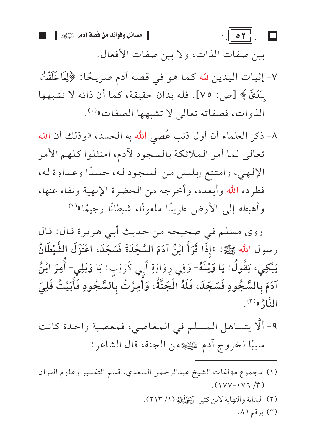 ٧ - إثبات اليدين لله كما هو في قصة آدم صريحًا: {لِمَا خَلَقْتُ بِيَدَيَّ} [ص: ٧٥]. فله يدان حقيقة، كما أن ذاته لا تشبهها الذوات، فصفاته تعالى لا تشبهها الصفات» (¬١).