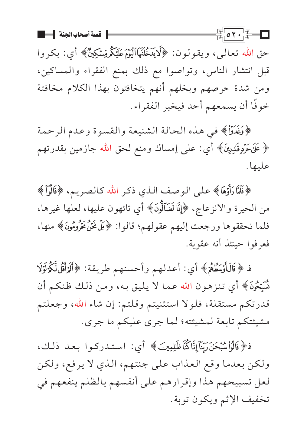حق الله تعالى، ويقولون: {لَا يَدْخُلَنَّهَا الْيَوْمَ عَلَيْكُمْ مِسْكِينٌ} أي: بكروا قبل انتشار الناس، وتواصوا مع ذلك بمنع الفقراء والمساكين، ومن شدة حرصهم وبخلهم أنهم يتخافتون بهذا الكلام مخافتة خوفًا أن يسمعهم أحد فيخبر الفقراء.