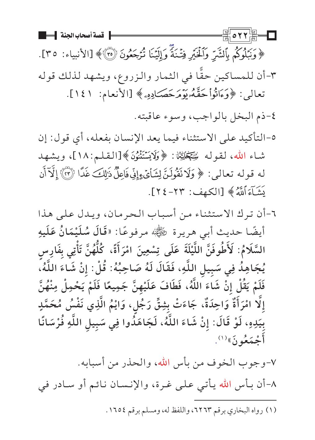 ٦ - أن ترك الاستثناء من أسباب الحرمان، ويدل على هذا أيضًا حديث أبي هريرة - رضي الله عنه - مرفوعًا: «قَالَ سُلَيْمَانُ عَلَيهِ السَّلَامُ: لَأَطُوفَنَّ اللَّيْلَةَ عَلَى تِسْعِينَ امْرَأَةً، كُلُّهُنَّ تَأْتِي بِفَارِسٍ يُجَاهِدُ فِي سَبِيلِ اللَّهِ، فَقَالَ لَهُ صَاحِبُهُ: قُلْ: إِنْ شَاءَ اللَّهُ، فَلَمْ يَقُلْ إِنْ شَاءَ اللَّهُ، فَطَافَ عَلَيْهِنَّ جَمِيعًا فَلَمْ يَحْمِلْ مِنْهُنَّ إِلَّا امْرَأَةٌ وَاحِدَةٌ، جَاءَتْ بِشِقِّ رَجُلٍ، وَايْمُ الَّذِي نَفْسُ مُحَمَّدٍ بِيَدِهِ، لَوْ قَالَ: إِنْ شَاءَ اللَّهُ، لَجَاهَدُوا فِي سَبِيلِ اللَّهِ فُرْسَانًا أَجْمَعُونَ» (¬١).