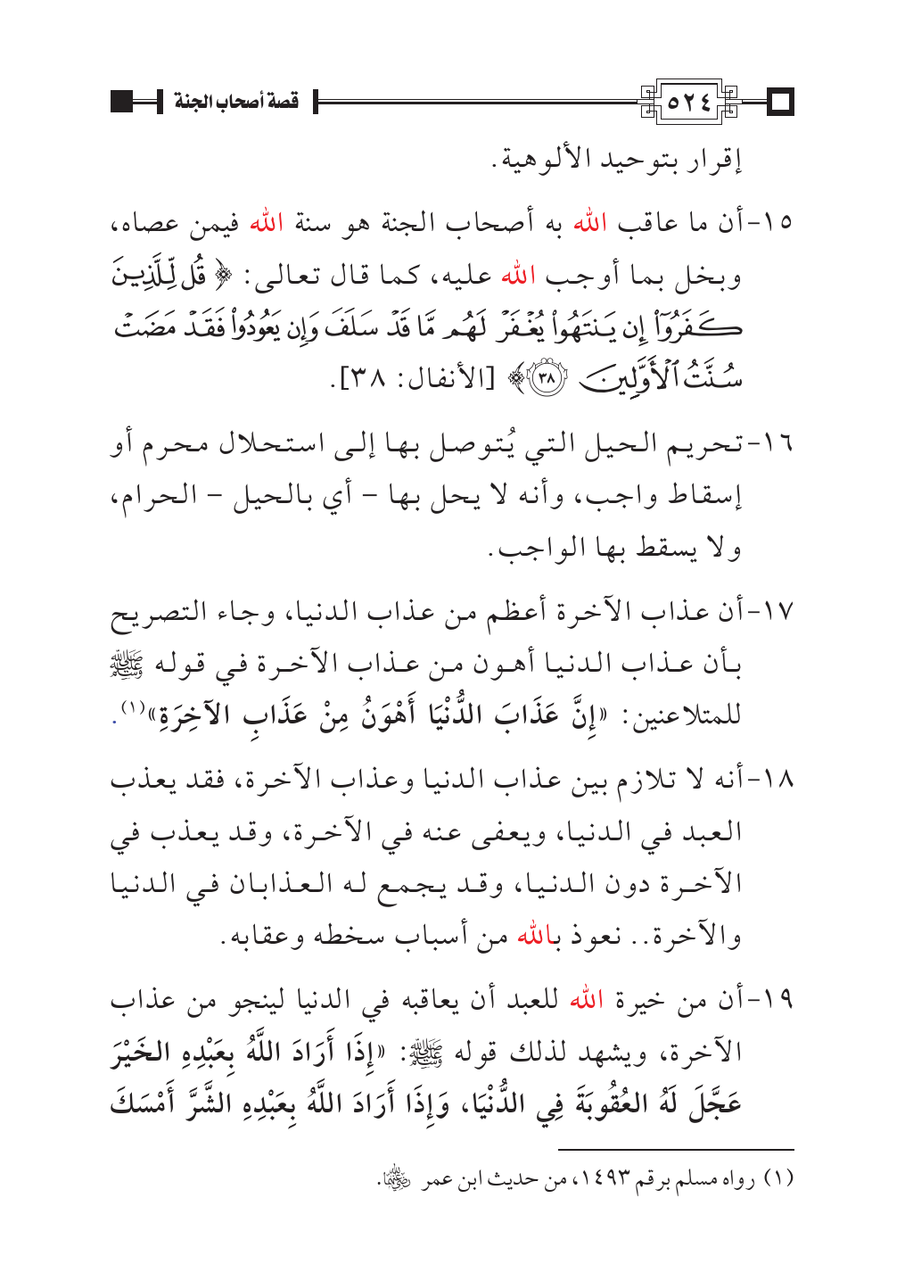 ١٥ - أن ما عاقب الله به أصحاب الجنة هو سنة الله فيمن عصاه، وبخل بما أوجب الله عليه، كما قال تعالى: {قُلْ لِلَّذِينَ كَفَرُوا إِنْ يَنْتَهُوا يُغْفَرْ لَهُمْ مَا قَدْ سَلَفَ وَإِنْ يَعُودُوا فَقَدْ مَضَتْ سُنَّتُ الْأَوَّلِينَ (٣٨)} [الأنفال: ٣٨].