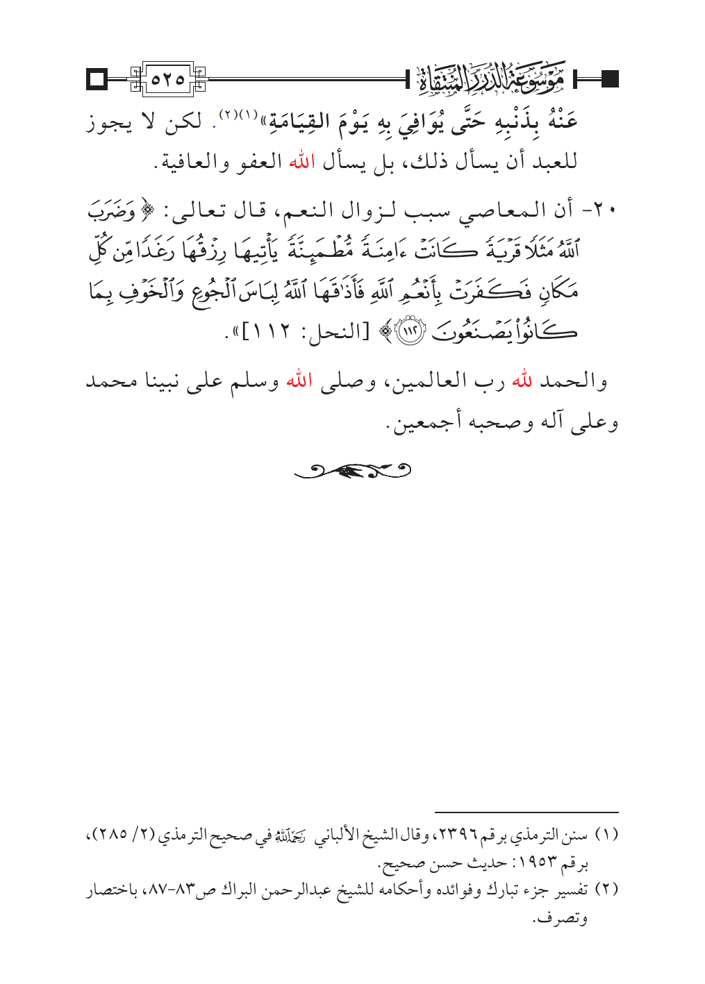 ٢٠ - أن المعاصي سبب لزوال النعم، قال تعالى: {وَضَرَبَ اللَّهُ مَثَلًا قَرْيَةً كَانَتْ آمِنَةً مُطْمَئِنَّةً يَأْتِيهَا رِزْقُهَا رَغَدًا مِنْ كُلِّ مَكَانٍ فَكَفَرَتْ بِأَنْعُمِ اللَّهِ فَأَذَاقَهَا اللَّهُ لِبَاسَ الْجُوعِ وَالْخَوْفِ بِمَا كَانُوا يَصْنَعُونَ (١١٢)} [النحل:١١٢]».