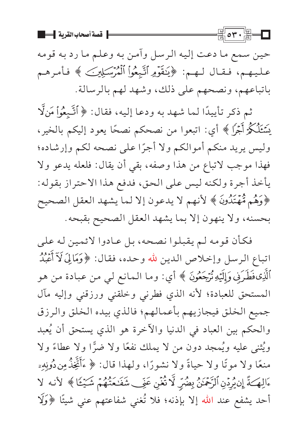 فكأن قومه لم يقبلوا نصحه، بل عادوا لائمين له على اتباع الرسل وإخلاص الدين لله وحده، فقال: {وَمَا لِيَ لَا أَعْبُدُ الَّذِي فَطَرَنِي وَإِلَيْهِ تُرْجَعُونَ} أي: وما المانع لي من عبادة من هو المستحق للعبادة؛ لأنه الذي فطرني وخلقني ورزقني وإليه مآل جميع الخلق فيجازيهم بأعمالهم؛ فالذي بيده الخلق والرزق والحكم بين العباد في الدنيا والآخرة هو الذي يستحق أن يُعبد ويُثنى عليه ويُمجد دون من لا يملك نفعًا ولا ضرًّا ولا عطاءً ولا منعًا ولا موتًا ولا حياةً ولا نشورًا، ولهذا قال: {أَأَتَّخِذُ مِنْ دُونِهِ آلِهَةً إِنْ يُرِدْنِ الرَّحْمَنُ بِضُرٍّ لَا تُغْنِ عَنِّي شَفَاعَتُهُمْ شَيْئًا} لأنه لا أحد يشفع عند الله إلا بإذنه؛ فلا تُغني شفاعتهم عني شيئًا {وَلَا