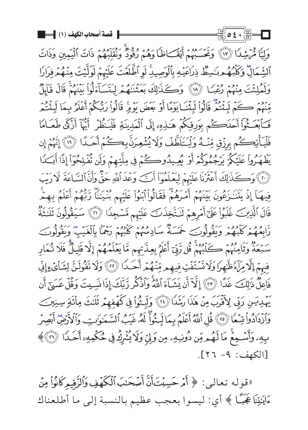 كَمْ لَبِثْتُمْ قَالُوا لَبِثْنَا يَوْمًا أَوْ بَعْضَ يَوْمٍ قَالُوا رَبُّكُمْ أَعْلَمُ بِمَا لَبِثْتُمْ فَابْعَثُوا أَحَدَكُمْ بِوَرِقِكُمْ هَذِهِ إِلَى الْمَدِينَةِ فَلْيَنْظُرْ أَيُّهَا أَزْكَى طَعَامًا فَلْيَأْتِكُمْ بِرِزْقٍ مِنْهُ وَلْيَتَلَطَّفْ وَلَا يُشْعِرَنَّ بِكُمْ أَحَدًا (١٩) إِنَّهُمْ إِنْ يَظْهَرُوا عَلَيْكُمْ يَرْجُمُوكُمْ أَوْ يُعِيدُوكُمْ فِي مِلَّتِهِمْ وَلَنْ تُفْلِحُوا إِذًا أَبَدًا (٢٠) وَكَذَلِكَ أَعْثَرْنَا عَلَيْهِمْ لِيَعْلَمُوا أَنَّ وَعْدَ اللَّهِ حَقٌّ وَأَنَّ السَّاعَةَ لَا رَيْبَ فِيهَا إِذْ يَتَنَازَعُونَ بَيْنَهُمْ أَمْرَهُمْ فَقَالُوا ابْنُوا عَلَيْهِمْ بُنْيَانًا رَبُّهُمْ أَعْلَمُ بِهِمْ قَالَ الَّذِينَ غَلَبُوا عَلَى أَمْرِهِمْ لَنَتَّخِذَنَّ عَلَيْهِمْ مَسْجِدًا (٢١) سَيَقُولُونَ ثَلَاثَةٌ رَابِعُهُمْ كَلْبُهُمْ وَيَقُولُونَ خَمْسَةٌ سَادِسُهُمْ كَلْبُهُمْ رَجْمًا بِالْغَيْبِ وَيَقُولُونَ سَبْعَةٌ وَثَامِنُهُمْ كَلْبُهُمْ قُلْ رَبِّي أَعْلَمُ بِعِدَّتِهِمْ مَا يَعْلَمُهُمْ إِلَّا قَلِيلٌ فَلَا تُمَارِ فِيهِمْ إِلَّا مِرَاءً وَلَا فِيهِمْ مِنْهُمْ أَحَدًا (٢٢) وَلَا تَقُولَنَّ لِشَيْءٍ إِنِّي فَاعِلٌ ذَلِكَ غَدًا (٢٣) إِلَّا أَنْ يَشَاءَ اللَّهُ وَاذْكُرْ رَبَّكَ إِذَا نَسِيتَ وَقُلْ عَسَى أَنْ يَهْدِيَنِ رَبِّي لِأَقْرَبَ مِنْ هَذَا رَشَدًا (٢٤) وَلَبِثُوا فِي كَهْفِهِمْ ثَلَاثَ مِائَةٍ سِنِينَ وَازْدَادُوا تِسْعًا (٢٥) قُلِ اللَّهُ أَعْلَمُ بِمَا لَبِثُوا لَهُ غَيْبُ السَّمَاوَاتِ وَالْأَرْضِ أَبْصِرْ بِهِ وَأَسْمِعْ مَا لَهُمْ مِنْ دُونِهِ مِنْ وَلِيٍّ وَلَا يُشْرِكُ فِي حُكْمِهِ أَحَدًا (٢٦)} [الكهف: ٩ - ٢٦].