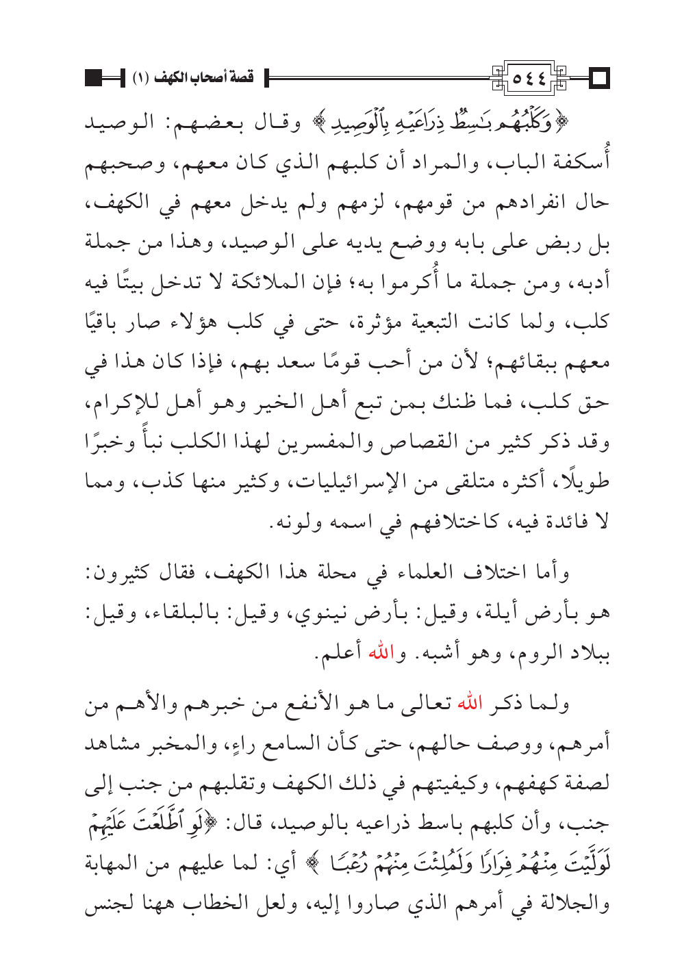 {وَكَلْبُهُمْ بَاسِطٌ ذِرَاعَيْهِ بِالْوَصِيدِ} وقال بعضهم: الوصيد أُسكفة الباب، والمراد أن كلبهم الذي كان معهم، وصحبهم حال انفرادهم من قومهم، لزمهم ولم يدخل معهم في الكهف، بل ربض على بابه ووضع يديه على الوصيد، وهذا من جملة أدبه، ومن جملة ما أُكرموا به؛ فإن الملائكة لا تدخل بيتًا فيه كلب، ولما كانت التبعية مؤثرة، حتى في كلب هؤلاء صار باقيًا معهم ببقائهم؛ لأن من أحب قومًا سعد بهم، فإذا كان هذا في حق كلب، فما ظنك بمن تبع أهل الخير وهو أهل للإكرام، وقد ذكر كثير من القصاص والمفسرين لهذا الكلب نبأً وخبرًا طويلًا، أكثره متلقى من الإسرائيليات، وكثير منها كذب، ومما لا فائدة فيه، كاختلافهم في اسمه ولونه.