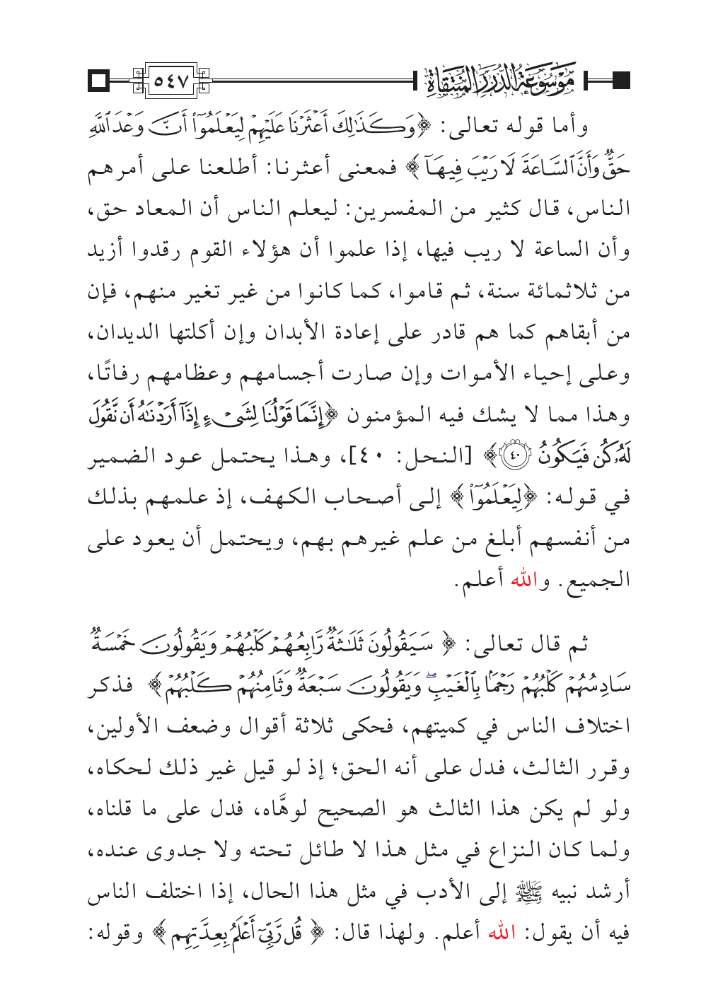 ثم قال تعالى: {سَيَقُولُونَ ثَلَاثَةٌ رَابِعُهُمْ كَلْبُهُمْ وَيَقُولُونَ خَمْسَةٌ سَادِسُهُمْ كَلْبُهُمْ رَجْمًا بِالْغَيْبِ وَيَقُولُونَ سَبْعَةٌ وَثَامِنُهُمْ كَلْبُهُمْ} فذكر اختلاف الناس في كميتهم، فحكى ثلاثة أقوال وضعف الأولين، وقرر الثالث، فدل على أنه الحق؛ إذ لو قيل غير ذلك لحكاه، ولو لم يكن هذا الثالث هو الصحيح لوهَّاه، فدل على ما قلناه، ولما كان النزاع في مثل هذا لا طائل تحته ولا جدوى عنده، أرشد نبيه - صلى الله عليه وسلم - إلى الأدب في مثل هذا الحال، إذا اختلف الناس فيه أن يقول: الله أعلم. ولهذا قال: {قُلْ رَبِّي أَعْلَمُ بِعِدَّتِهِمْ} وقوله: