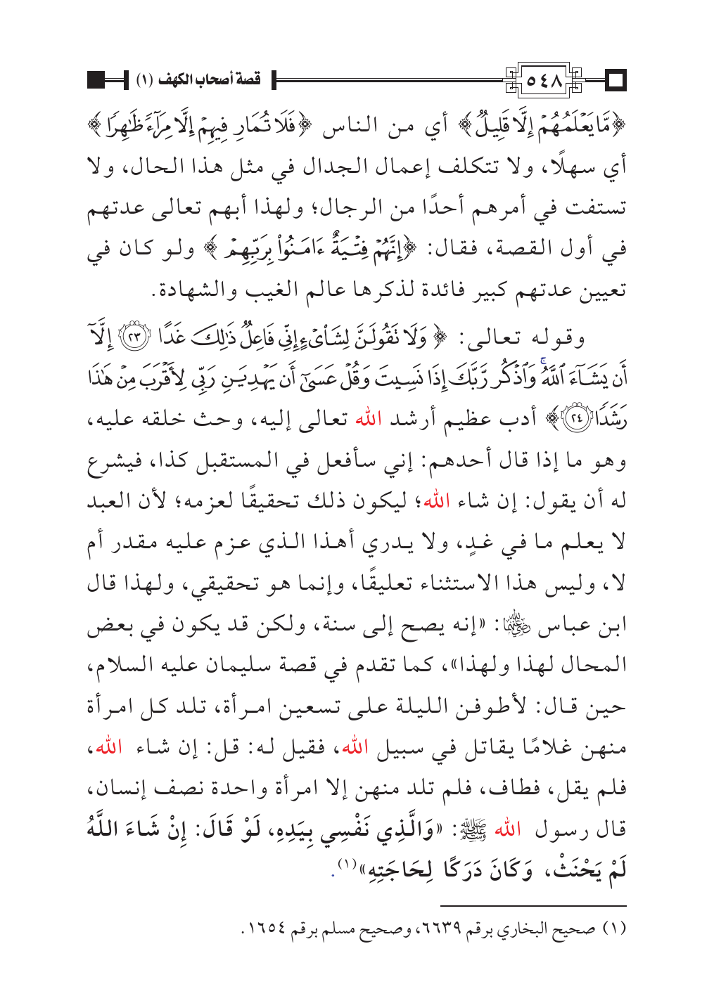 وقوله تعالى: {وَلَا تَقُولَنَّ لِشَيْءٍ إِنِّي فَاعِلٌ ذَلِكَ غَدًا (٢٣) إِلَّا أَنْ يَشَاءَ اللَّهُ وَاذْكُرْ رَبَّكَ إِذَا نَسِيتَ وَقُلْ عَسَى أَنْ يَهْدِيَنِ رَبِّي لِأَقْرَبَ مِنْ هَذَا رَشَدًا (٢٤)} أدب عظيم أرشد الله تعالى إليه، وحث خلقه عليه، وهو ما إذا قال أحدهم: إني سأفعل في المستقبل كذا، فيشرع له أن يقول: إن شاء الله؛ ليكون ذلك تحقيقًا لعزمه؛ لأن العبد لا يعلم ما في غدٍ، ولا يدري أهذا الذي عزم عليه مقدر أم لا، وليس هذا الاستثناء تعليقًا، وإنما هو تحقيقي، ولهذا قال ابن عباس - رضي الله عنهما -: «إنه يصح إلى سنة، ولكن قد يكون في بعض المحال لهذا ولهذا»، كما تقدم في قصة سليمان - عليه السلام -، حين قال: لأطوفن الليلة على تسعين امرأة، تلد كل امرأة منهن غلامًا يقاتل في سبيل الله، فقيل له: قل: إن شاء الله، فلم يقل، فطاف، فلم تلد منهن إلا امرأة واحدة نصف إنسان، قال رسول الله - صلى الله عليه وسلم -: «وَالَّذِي نَفْسِي بِيَدِهِ، لَوْ قَالَ: إِنْ شَاءَ اللَّهُ لَمْ يَحْنَثْ، وَكَانَ دَرَكًا لِحَاجَتِهِ» (¬١).