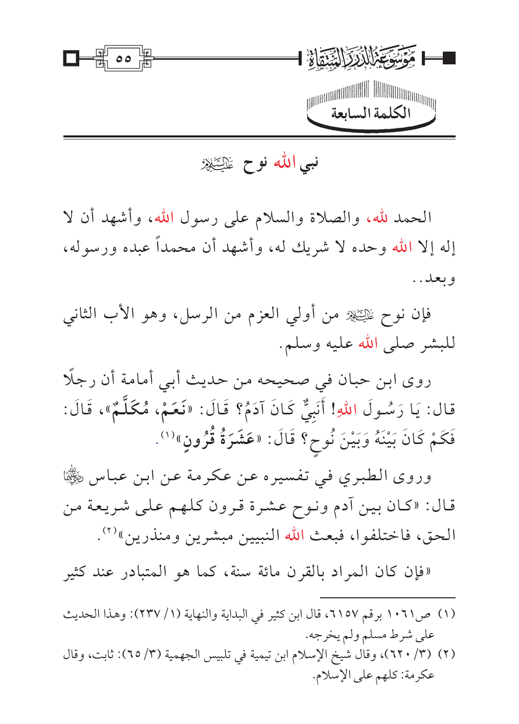 وروى الطبري في تفسيره عن عكرمة عن ابن عباس - رضي الله عنهما - قال: «كان بين آدم ونوح عشرة قرون كلهم على شريعة من الحق، فاختلفوا، فبعث الله النبيين مبشرين ومنذرين» (¬٢).
