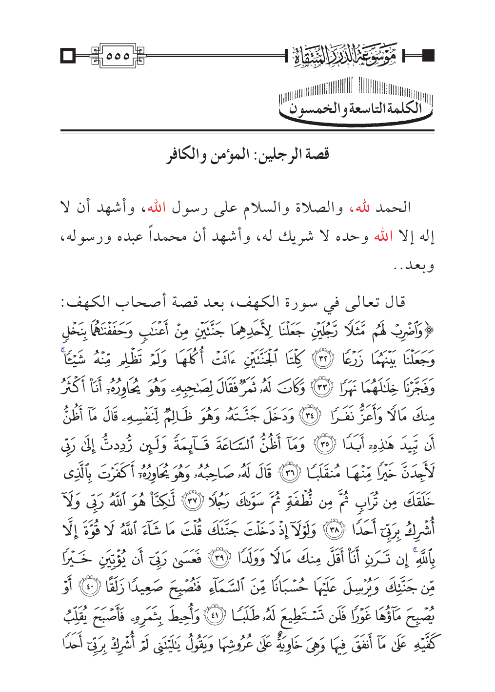 قال تعالى في سورة الكهف، بعد قصة أصحاب الكهف: {وَاضْرِبْ لَهُمْ مَثَلًا رَجُلَيْنِ جَعَلْنَا لِأَحَدِهِمَا جَنَّتَيْنِ مِنْ أَعْنَابٍ وَحَفَفْنَاهُمَا بِنَخْلٍ وَجَعَلْنَا بَيْنَهُمَا زَرْعًا (٣٢) كِلْتَا الْجَنَّتَيْنِ آتَتْ أُكُلَهَا وَلَمْ تَظْلِمْ مِنْهُ شَيْئًا وَفَجَّرْنَا خِلَالَهُمَا نَهَرًا (٣٣) وَكَانَ لَهُ ثَمَرٌ فَقَالَ لِصَاحِبِهِ وَهُوَ يُحَاوِرُهُ أَنَا أَكْثَرُ مِنْكَ مَالًا وَأَعَزُّ نَفَرًا (٣٤) وَدَخَلَ جَنَّتَهُ وَهُوَ ظَالِمٌ لِنَفْسِهِ قَالَ مَا أَظُنُّ أَنْ تَبِيدَ هَذِهِ أَبَدًا (٣٥) وَمَا أَظُنُّ السَّاعَةَ قَائِمَةً وَلَئِنْ رُدِدْتُ إِلَى رَبِّي لَأَجِدَنَّ خَيْرًا مِنْهَا مُنْقَلَبًا (٣٦) قَالَ لَهُ صَاحِبُهُ وَهُوَ يُحَاوِرُهُ أَكَفَرْتَ بِالَّذِي خَلَقَكَ مِنْ تُرَابٍ ثُمَّ مِنْ نُطْفَةٍ ثُمَّ سَوَّاكَ رَجُلًا (٣٧) لَكِنَّا هُوَ اللَّهُ رَبِّي وَلَا أُشْرِكُ بِرَبِّي أَحَدًا (٣٨) وَلَوْلَا إِذْ دَخَلْتَ جَنَّتَكَ قُلْتَ مَا شَاءَ اللَّهُ لَا قُوَّةَ إِلَّا بِاللَّهِ إِنْ أَنَا مِنْكَ مَالًا وَوَلَدًا (٣٩) فَعَسَى رَبِّي أَنْ يُؤْتِيَنِ خَيْرًا مِنْ جَنَّتِكَ وَيُرْسِلَ عَلَيْهَا حُسْبَانًا مِنَ السَّمَاءِ فَتُصْبِحَ صَعِيدًا زَلَقًا (٤٠) أَوْ يُصْبِحَ مَاؤُهَا غَوْرًا فَلَنْ تَسْتَطِيعَ لَهُ طَلَبًا (٤١) وَأُحِيطَ بِثَمَرِهِ فَأَصْبَحَ يُقَلِّبُ كَفَّيْهِ عَلَى مَا أَنْفَقَ فِيهَا وَهِيَ خَاوِيَةٌ عَلَى عُرُوشِهَا وَيَقُولُ يَالَيْتَنِي لَمْ أُشْرِكْ بِرَبِّي أَحَدًا