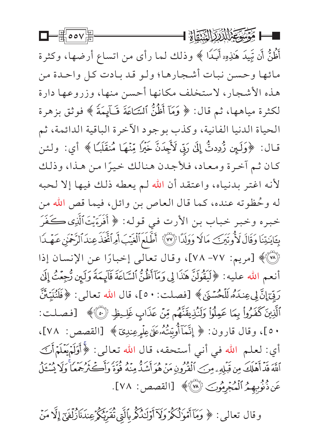 أَظُنُّ أَنْ تَبِيدَ هَذِهِ أَبَدًا} وذلك لما رأى من اتساع أرضها، وكثرة مائها وحسن نبات أشجارها؛ ولو قد بادت كل واحدة من هذه الأشجار، لاستخلف مكانها أحسن منها، وزروعها دارة لكثرة مياهها، ثم قال: {وَمَا أَظُنُّ السَّاعَةَ قَائِمَةً} فوثق بزهرة الحياة الدنيا الفانية، وكذب بوجود الآخرة الباقية الدائمة، ثم قال: {وَلَئِنْ رُدِدْتُ إِلَى رَبِّي لَأَجِدَنَّ خَيْرًا مِنْهَا مُنْقَلَبًا} أي: ولئن كان ثم آخرة ومعاد، فلأجدن هنالك خيرًا من هذا، وذلك لأنه اغتر بدنياه، واعتقد أن الله لم يعطه ذلك فيها إلا لحبه له وحُظوته عنده، كما قال العاص بن وائل، فيما قص الله من خبره وخبر خباب بن الأرت في قوله: {أَفَرَأَيْتَ الَّذِي كَفَرَ بِآيَاتِنَا وَقَالَ لَأُوتَيَنَّ مَالًا وَوَلَدًا (٧٧) أَطَّلَعَ الْغَيْبَ أَمِ اتَّخَذَ عِنْدَ الرَّحْمَنِ عَهْدًا (٧٨)} [مريم: ٧٧ - ٧٨]، وقال تعالى إخبارًا عن الإنسان إذا أنعم الله عليه: {هَذَا وَمَا أَظُنُّ السَّاعَةَ قَائِمَةً وَلَئِنْ رُجِعْتُ إِلَى رَبِّي إِنَّ لِي عِنْدَهُ لَلْحُسْنَى} [فصلت:٥٠]، قال الله تعالى: {فَلَنُنَبِّئَنَّ الَّذِينَ كَفَرُوا بِمَا عَمِلُوا وَلَنُذِيقَنَّهُمْ مِنْ عَذَابٍ غَلِيظٍ (٥٠)} [فصلت: ٥٠]، وقال قارون: {إِنَّمَا أُوتِيتُهُ عَلَى عِلْمٍ عِنْدِي} [القصص: ٧٨]، أي: لعلم الله في أني أستحقه، قال الله تعالى: {أَوَلَمْ يَعْلَمْ أَنَّ اللَّهَ قَدْ أَهْلَكَ مِنْ قَبْلِهِ مِنَ الْقُرُونِ مَنْ هُوَ أَشَدُّ مِنْهُ قُوَّةً وَأَكْثَرُ جَمْعًا وَلَا يُسْأَلُ عَنْ ذُنُوبِهِمُ الْمُجْرِمُونَ (٧٨)} [القصص:٧٨].