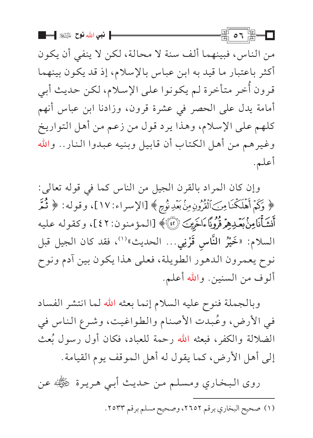 من الناس، فبينهما ألف سنة لا محالة، لكن لا ينفي أن يكون أكثر باعتبار ما قيد به ابن عباس بالإسلام، إذ قد يكون بينهما قرون أُخر متأخرة لم يكونوا على الإسلام، لكن حديث أبي أمامة يدل على الحصر في عشرة قرون، وزادنا ابن عباس أنهم كلهم على الإسلام، وهذا يرد قول من زعم من أهل التواريخ وغيرهم من أهل الكتاب أن قابيل وبنيه عبدوا النار .. والله أعلم.