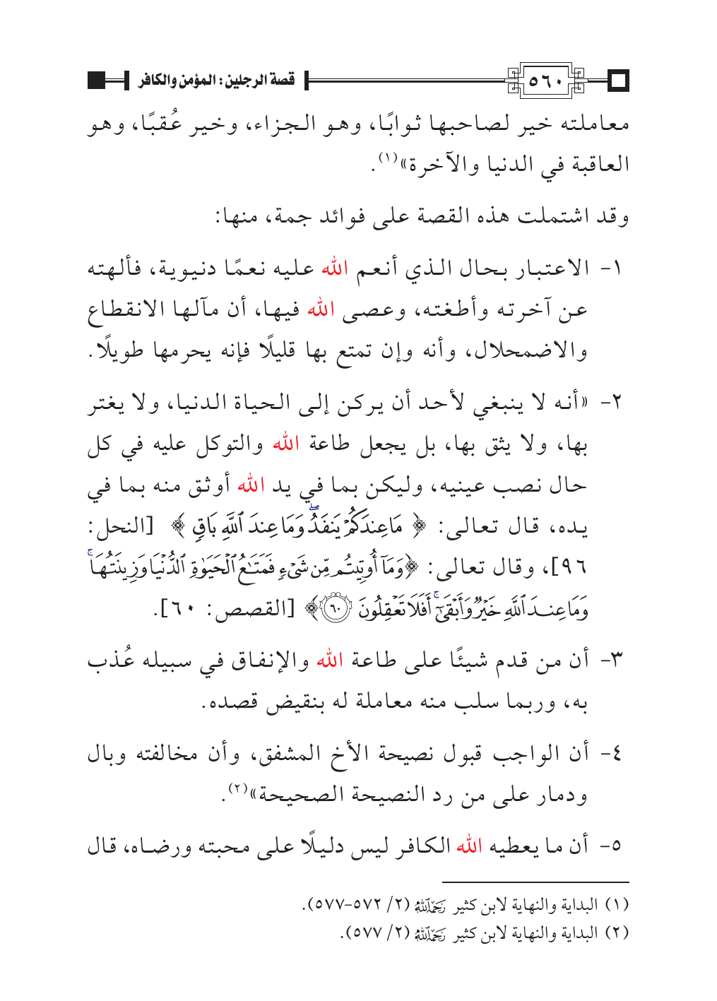 أن الواجب قبول نصيحة الأخ المشفق، وأن مخالفته وبال ودمار على من رد النصيحة الصحيحة» (¬٢).