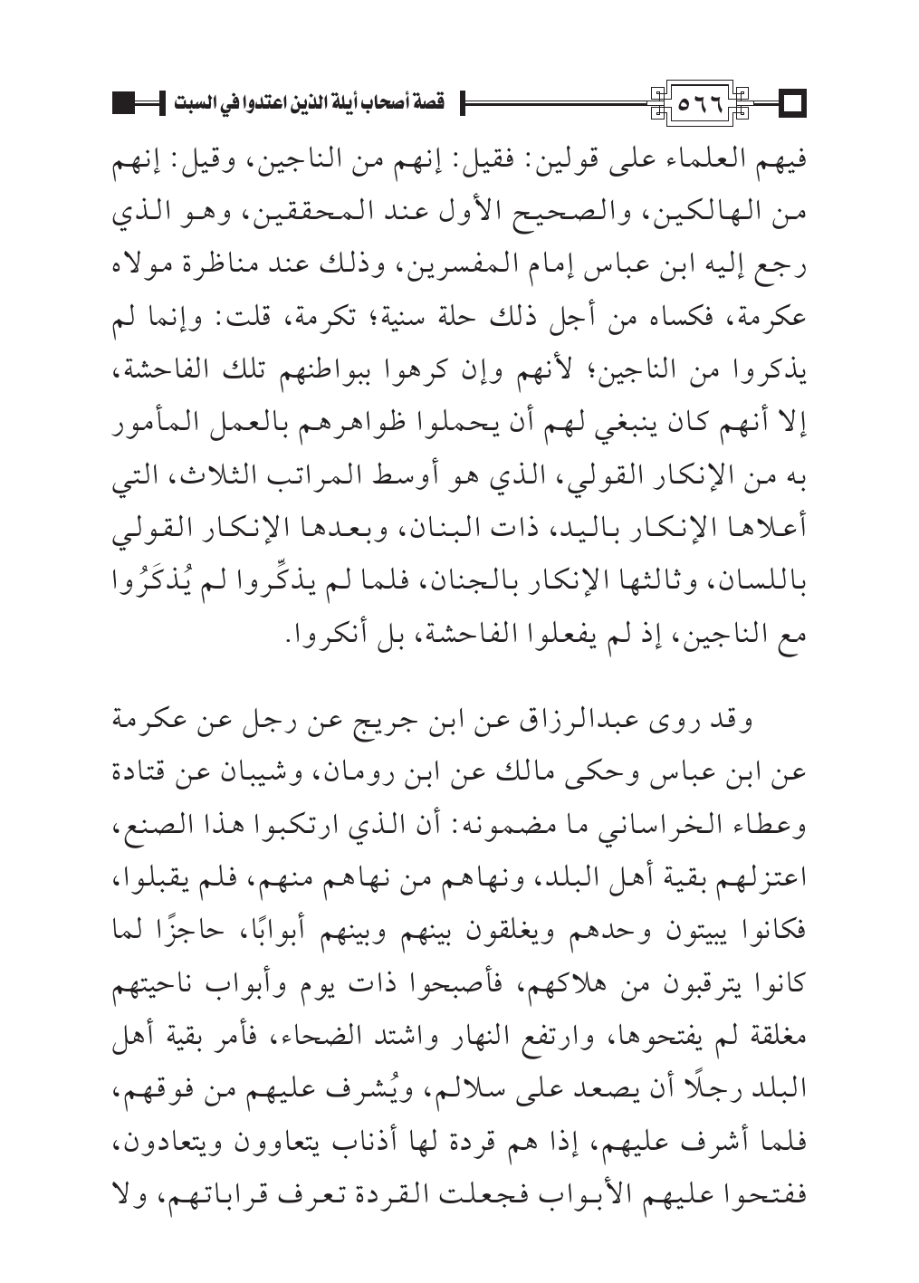 وقد روى عبدالرزاق عن ابن جريج عن رجل عن عكرمة عن ابن عباس وحكى مالك عن ابن رومان، وشيبان عن قتادة وعطاء الخراساني ما مضمونه: أن الذي ارتكبوا هذا الصنع، اعتزلهم بقية أهل البلد، ونهاهم من نهاهم منهم، فلم يقبلوا، فكانوا يبيتون وحدهم ويغلقون بينهم وبينهم أبوابًا، حاجزًا لما كانوا يترقبون من هلاكهم، فأصبحوا ذات يوم وأبواب ناحيتهم مغلقة لم يفتحوها، وارتفع النهار واشتد الضحاء، فأمر بقية أهل البلد رجلًا أن يصعد على سلالم، ويُشرف عليهم من فوقهم، فلما أشرف عليهم، إذا هم قردة لها أذناب يتعاوون ويتعادون، ففتحوا عليهم الأبواب فجعلت القردة تعرف قراباتهم، ولا