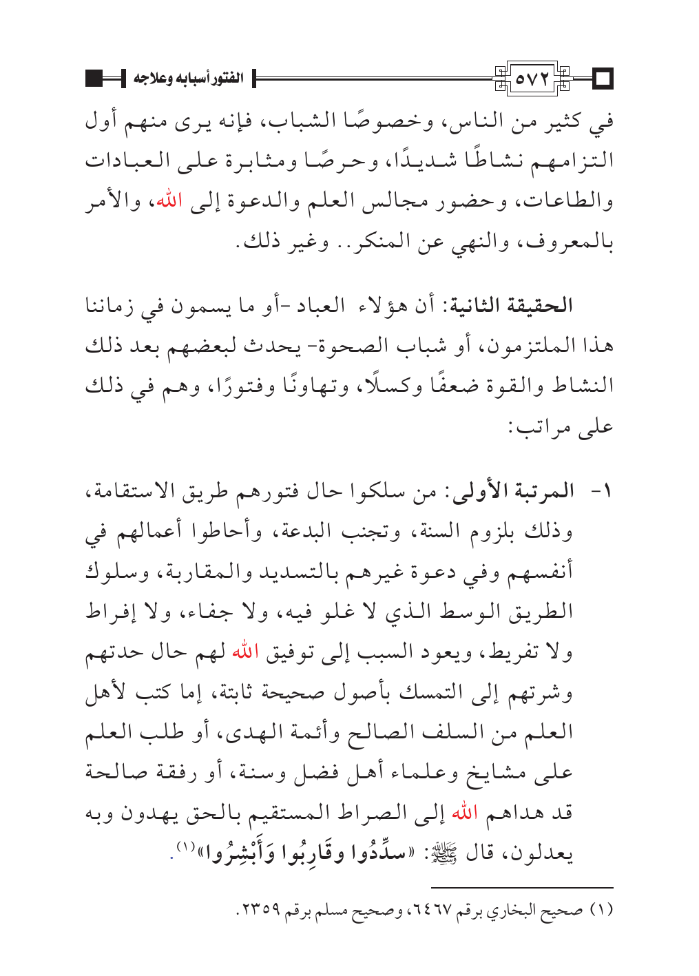 المرتبة الأولى: من سلكوا حال فتورهم طريق الاستقامة، وذلك بلزوم السنة، وتجنب البدعة، وأحاطوا أعمالهم في أنفسهم وفي دعوة غيرهم بالتسديد والمقاربة، وسلوك الطريق الوسط الذي لا غلو فيه، ولا جفاء، ولا إفراط ولا تفريط، ويعود السبب إلى توفيق الله لهم حال حدتهم وشرتهم إلى التمسك بأصول صحيحة ثابتة، إما كتب لأهل العلم من السلف الصالح وأئمة الهدى، أو طلب العلم على مشايخ وعلماء أهل فضل وسنة، أو رفقة صالحة قد هداهم الله إلى الصراط المستقيم بالحق يهدون وبه يعدلون، قال - صلى الله عليه وسلم -: «سدِّدُوا وقَارِبُوا وَأَبْشِرُوا» (¬١).