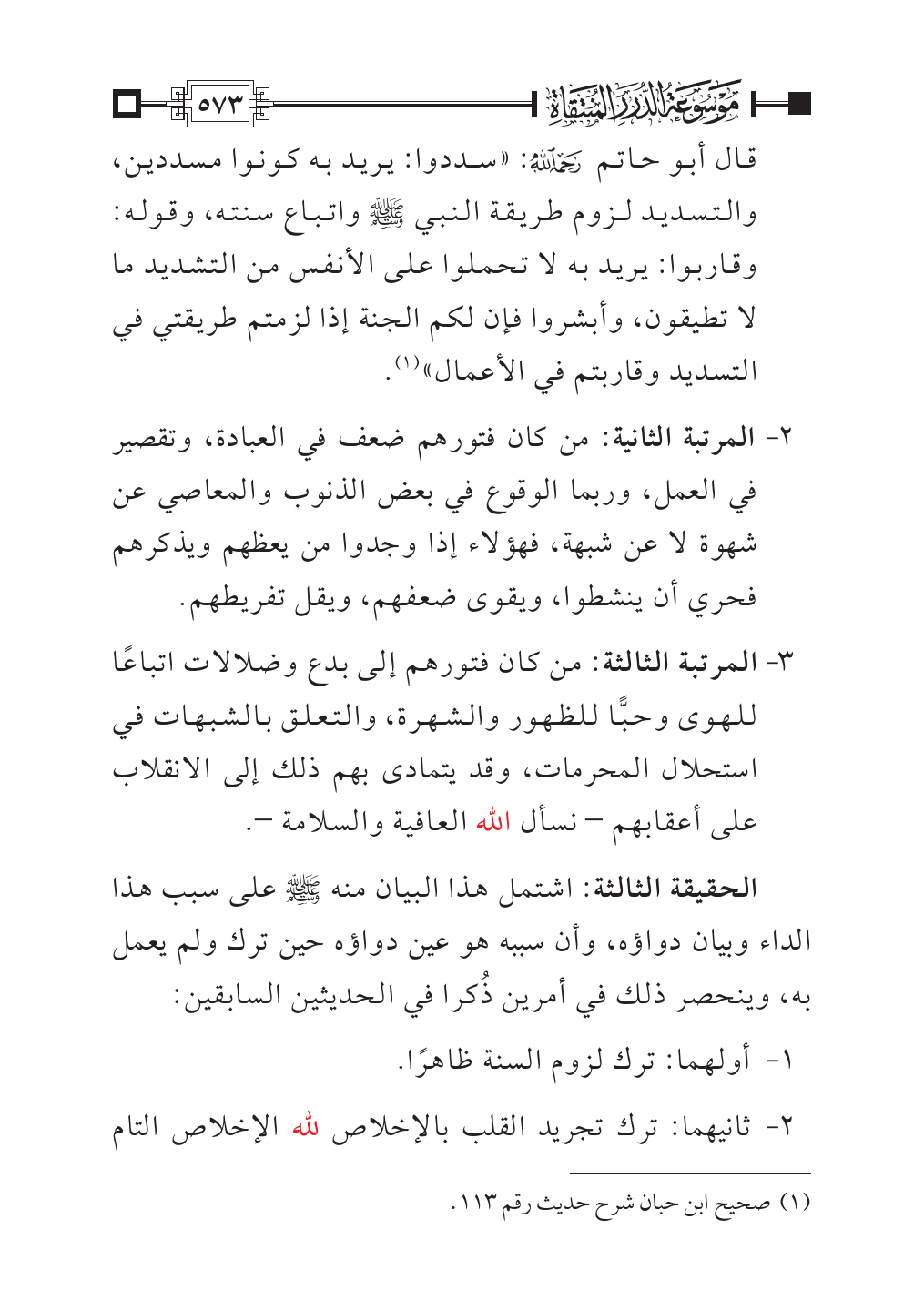 قال أبو حاتم - رحمه الله -: «سددوا: يريد به كونوا مسددين، والتسديد لزوم طريقة النبي - صلى الله عليه وسلم - واتباع سنته، وقوله: وقاربوا: يريد به لا تحملوا على الأنفس من التشديد ما لا تطيقون، وأبشروا فإن لكم الجنة إذا لزمتم طريقتي في التسديد وقاربتم في الأعمال» (¬١).
