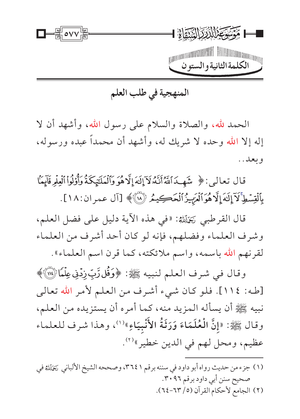 وقال في شرف العلم لنبيه - صلى الله عليه وسلم -: {وَقُلْ رَبِّ زِدْنِي عِلْمًا (١١٤)} [طه:١١٤]. فلو كان شيء أشرف من العلم لأمر الله تعالى نبيه - صلى الله عليه وسلم - أن يسأله المزيد منه، كما أمره أن يستزيده من العلم، وقال - صلى الله عليه وسلم -: «إِنَّ الْعُلَمَاءَ وَرَثَةُ الأَنْبِيَاءِ» (¬١)، وهذا شرف للعلماء عظيم، ومحل لهم في الدين خطير» (¬٢).